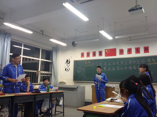 上周,高二年级(5)班的同学们利用班会课开展了一场别开生面的辩论会。由四个男生四个女生分别组成的强大的辩手团队就“当今社会应该是男主外女主内还是男女共同奋斗”的主题,在充足的材料数据、每个人心中的坚定想法和毫不退让的执着精神的支持下激烈辩论,为自己所支持的观点呼出最强音。