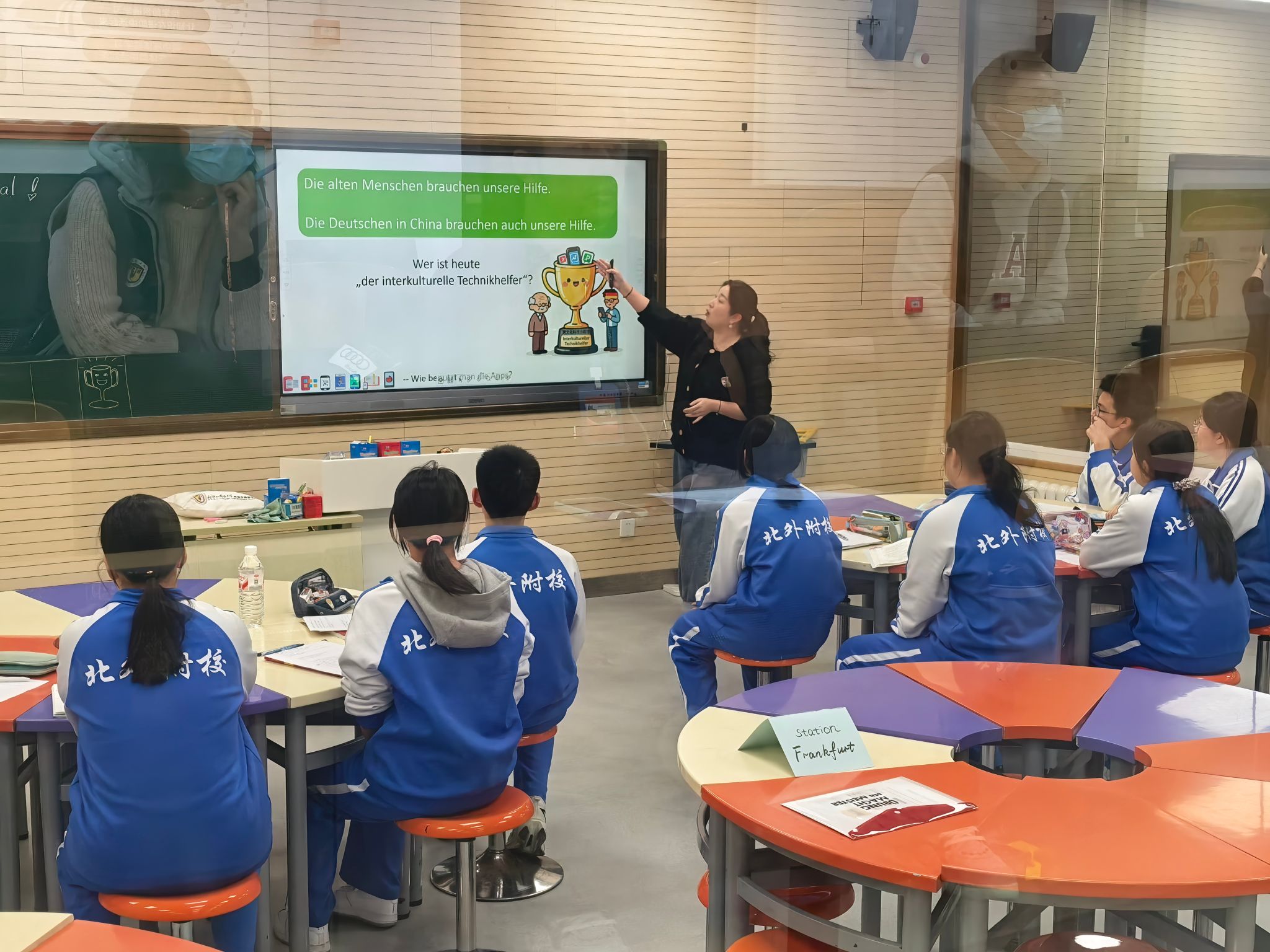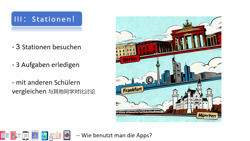 公开课的最大亮点在于采用“Stationen(站点任务)”学习模式。蒋老师围绕“帮助德国老太太适应中国生活”的核心情境,设置了德国城市主题站点,涵盖词汇连线、步骤图填顺序词、句子排序等分层任务。学生以小组为单位轮换完成任务,在自主探究与合作交流中巩固媒体词汇、顺序词及动词二位句型,充分体现了“以学生为中心”的教学理念,有效激发了性格安静学生的参与热情。