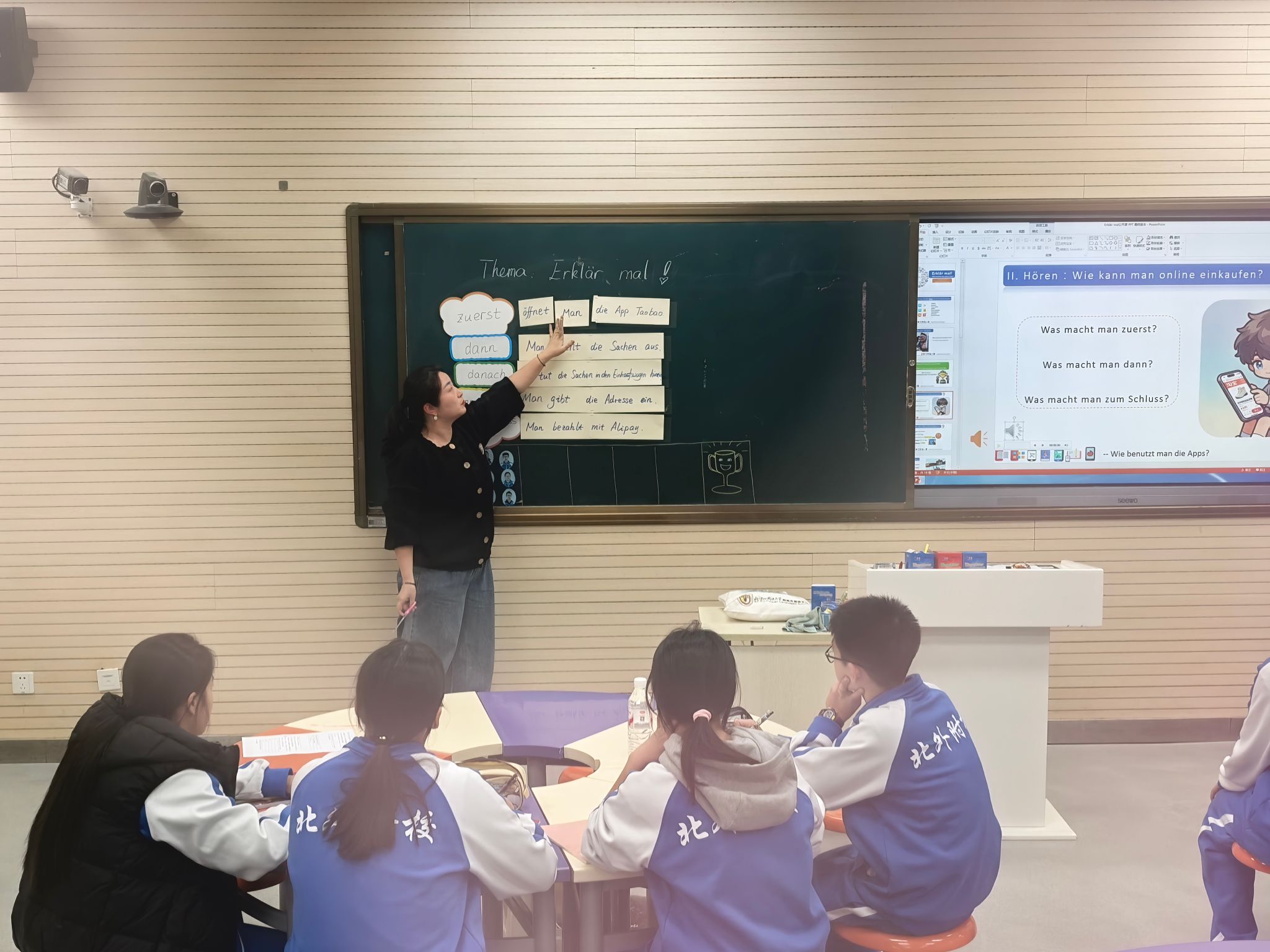 2025年12月5日,北外附校德语备课组长蒋煜恒老师执教的《Erklär mal! 教我怎么做!》公开课圆满落幕。本次公开课作为《开心学德语A2》第4单元的综合运用课,以丰富的教学形式、学生为主体的课堂设计及AI技术的创新应用,获得了听课教师的一致好评。