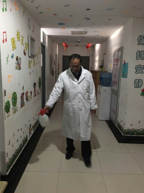 校医孟大夫为班级消毒