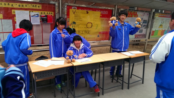 3月3日和4日中午,我校团委学生会共同组织的“靓丽风采,印象北外”活动拉开帷幕。高一六班王璐同学将她设计的“校服小熊”带入了校园,在校团委和学生会的支持下,向广大的初高中同学展开义卖。所筹得的善款,由学校志愿者团体“跳格子”社团通过捐赠书籍的形式帮助孤儿院的孩子们,让他们在这三月里也能感受到春天的温暖。