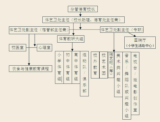 成立体艺卫处,配备专职、兼职干部和管理人员,在分管德育校长的直接分管下,管理或协调体育教学与群体活动、学生群众性艺术活动、校外教育活动、心理辅导室、校医室、国瑞厅、校电视台、微电影工作室、陶艺吧(筹)等工作或有关部门。小学艺术教研组、全校艺术课堂日常教学活动仍由各学部分头负责,体艺课堂教学的一般教学事宜,在“条”上仍属分管教学校长协调。