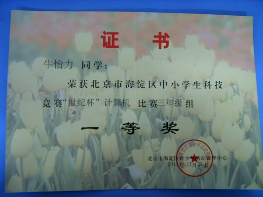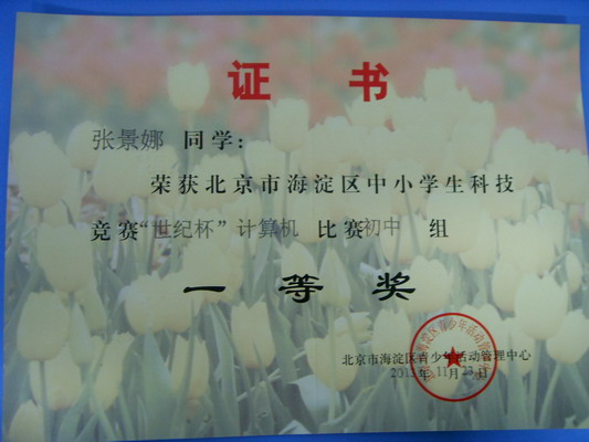 11月23日,海淀区中小学生“世纪杯”计算机竞赛在北京师范大学如期举行。我校50名中小学生队员在郭华、燕英中老师的带领下参加此次比赛。在高手云集的比赛中,我校获得5个一等奖、2个二等奖和20个三等奖的好成绩。