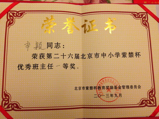 我校班主任辛颖老师荣获第二十六届北京市中小学紫禁杯优秀班主任一等奖。
