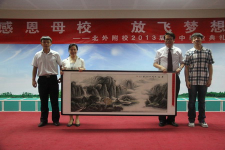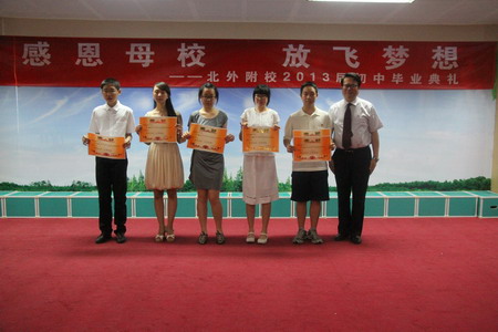北京市先进班集体所在班级的班主任辛颖老师寄语全体毕业生“除了阳光和空气是大自然赋予的,其他一切都要靠你的努力和奋斗去争取”。家长代表初三(6)班蒋雅琴同学的母亲曾女士在发言中表达了对学校与老师的感谢,期望每一个孩子都成人成才。数学满分获得者黄飞跃同学代表毕业生感谢老师和学校教会自己如何生活、求知和做人,作为附校毕业生今后都将谨记母校的训导“博学笃行,兼容并蓄”,都会唱响校歌《让梦想在北外附校绽放》,朝着新的梦想前行。