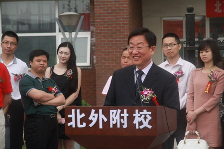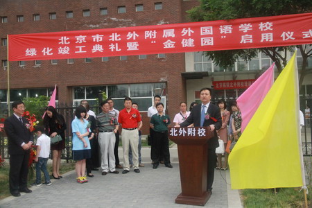 北京外国语大学党委书记杨学义对“金健园”的正式启用表示热烈祝贺,向金健先生的慷慨捐赠致以崇高敬意,向施工单位和全体工程人员的辛勤工作表示衷心感谢。杨书记肯定了我校自复办以来取得的进步和成就,尤其对近二年来,学校在海淀基础教育领域不断扩大的知名度和影响力表示充分肯定。杨书记代表北京外国语大学,向附校全体教职员工致以衷心的感谢和亲切的问候,并表示,北京外国语大学将作为附校的坚强后盾,一如既往地支持附校的建设和发展。希望附校全体教职工能弘扬金健先生的大爱之心,爱学生、爱学校、爱教育事业;希望全体学生学习金健先生的无私奉献精神,“爱己、爱人、爱物”,从小树立服务他人、服务社会的责任意识和奉献精神。