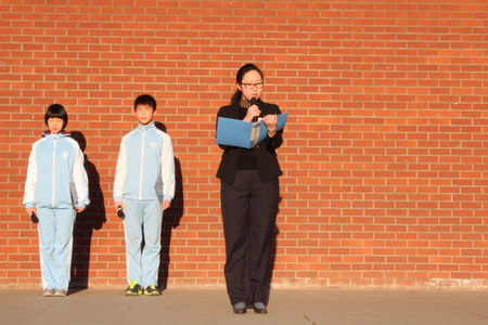 2013年3月4日上午,我校学校领导、中学部全体师生及行政部门员工在操场隆重集会,举行2012-2013学年度第二学期第2周升旗仪式。来自初二(2)班张泠然和徐沪台两位同学分别用中英双语作了大会主持。主持人首先对来自高三(1)班的升旗手夏浩然同学作了简明扼要的介绍,与此同时,该同学登台亮相。由高一年级同学组成的国旗护卫方队迈着整齐的步伐把国旗护送至升旗台。在全体师生注目礼中,护旗手奋力将国旗抛向空中,伴着雄壮激昂的义勇军进行曲,鲜艳的五星红旗在晨曦的第一缕阳光中冉冉升起在学校的上空。