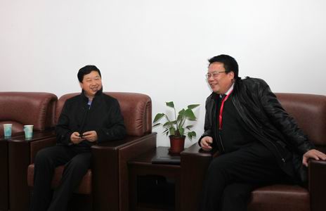 海淀区人民政府教育督导室副主任杜荣贞(左)在汇报会前与林卫民校长亲切交谈