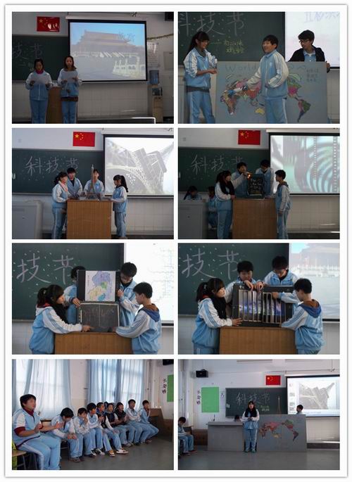 每组同学主要介绍了他们作品的创意、制作的过程、作品的特点,并且介绍了许多与作品相关的科技知识、历史知识,预测了这一科技领域未来的发展趋势。如:刘好点同学这一组的作品,既展示了明清时期北京的旧貌,又通过扇形图片变换出现今北京的新貌。展示了北京的城市布局,让人感受到北京的巨大变化。他们还用铁丝在有机玻璃上粘出北京2015年的地铁示意图,直观的展现了北京将来的发展变化。