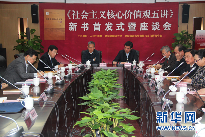 新华网北京10月19日电 18日上午,人民出版社、北京外国语大学、北京师范大学价值与文化研究中心联合主办了《社会主义核心价值观五讲》新书首发式暨座谈会。中宣部副部长申维辰、新闻出版总署副署长邬书林出席。