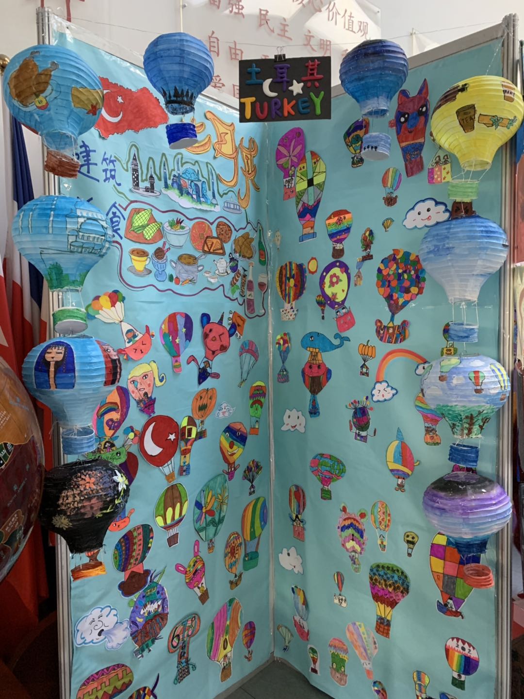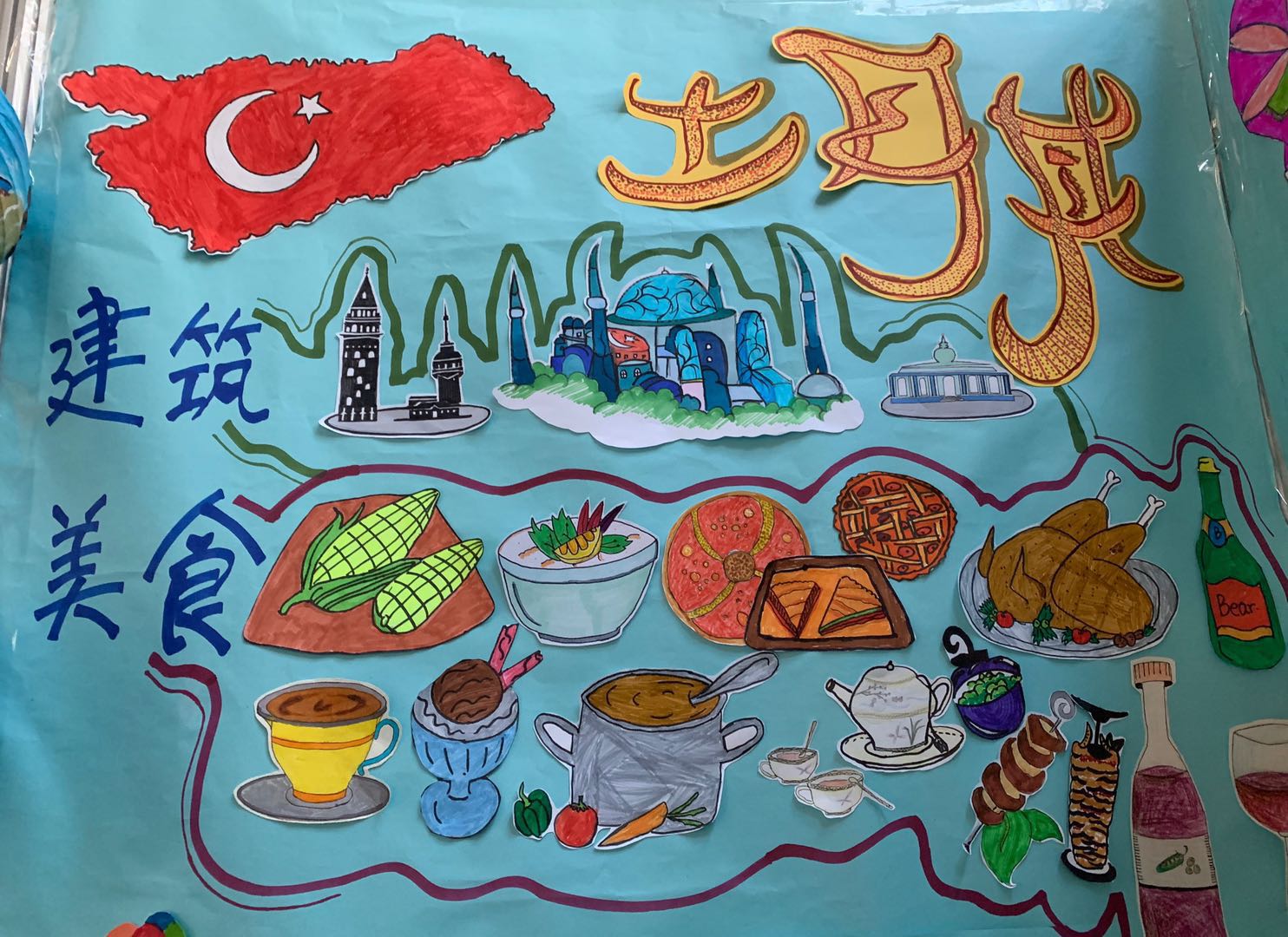 在我校庆元旦“艺术世界”主题画展中,我带领一年级的同学认识和了解了土耳其这个国家,在课上为学生们介绍了土耳其的文化,美食和手工艺品等。