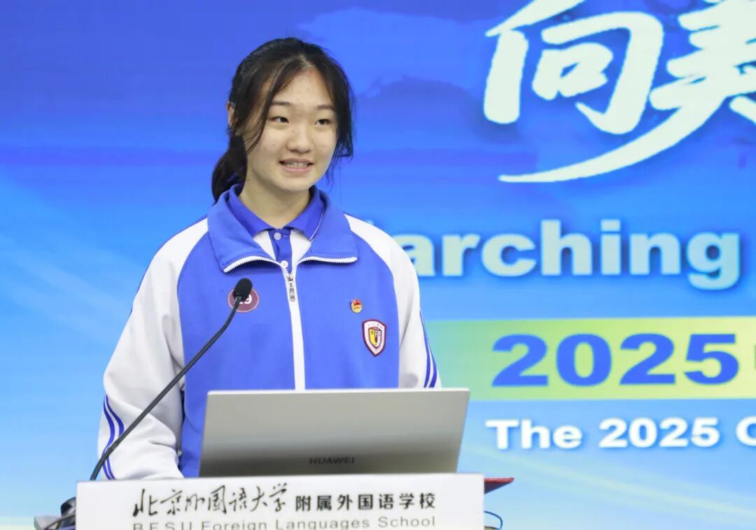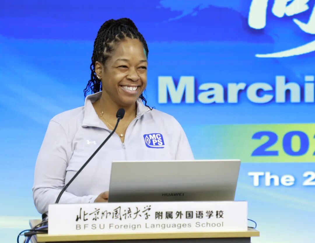 美国蒙哥马利郡教育局领导洛根·基莎·妮可(Logan Kisha Nicole)女士在发言中感谢北外附校的热情组织,她表示,这次中国之行不仅是一次艺术展示,更是一次文化的对话与心灵的共鸣,期待两国青少年在交流中收获成长与友谊。