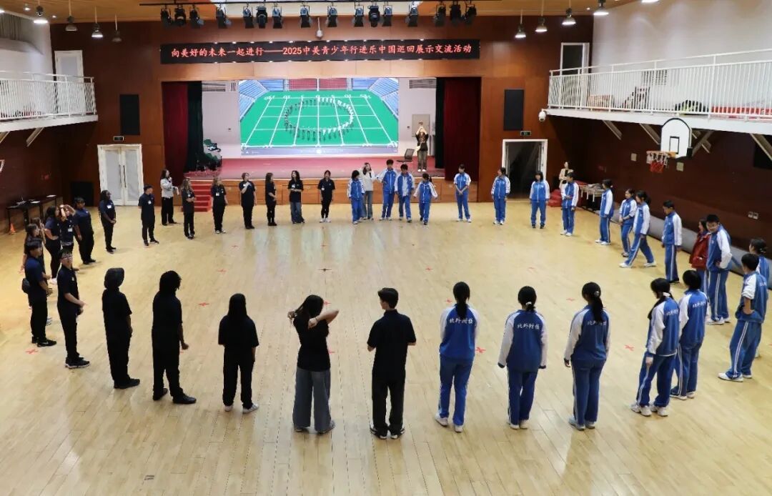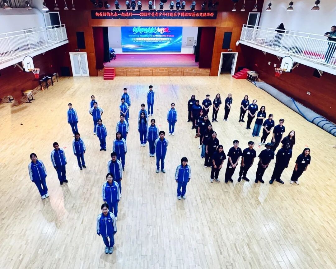 最令人动容的是两国青少年共同完成的“和”字行进展示。一起跟写“和”字,理解“和”所代表的和平、和谐之意后,大家以身体为笔、步伐为墨,通过反复练习与紧密配合,在场地上走出一个完整而有力的“和”字。那一刻,文化在节奏中融合,友谊在行进中生根。