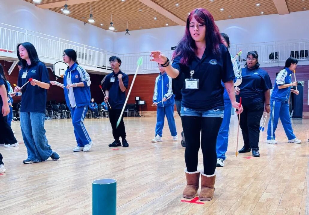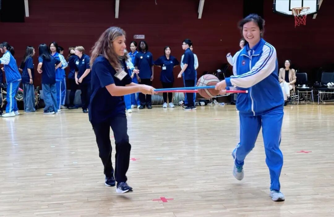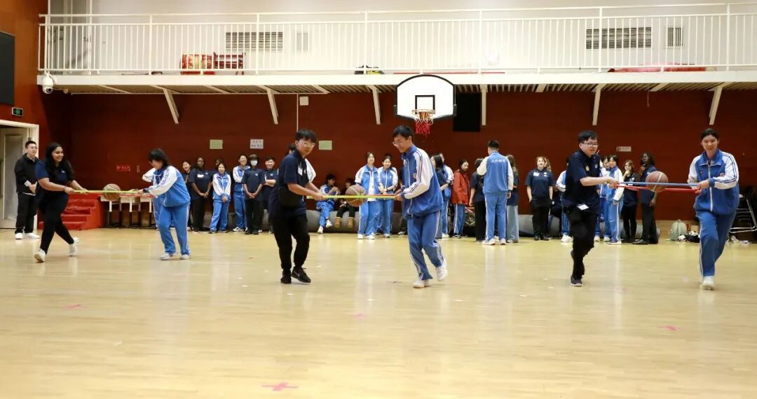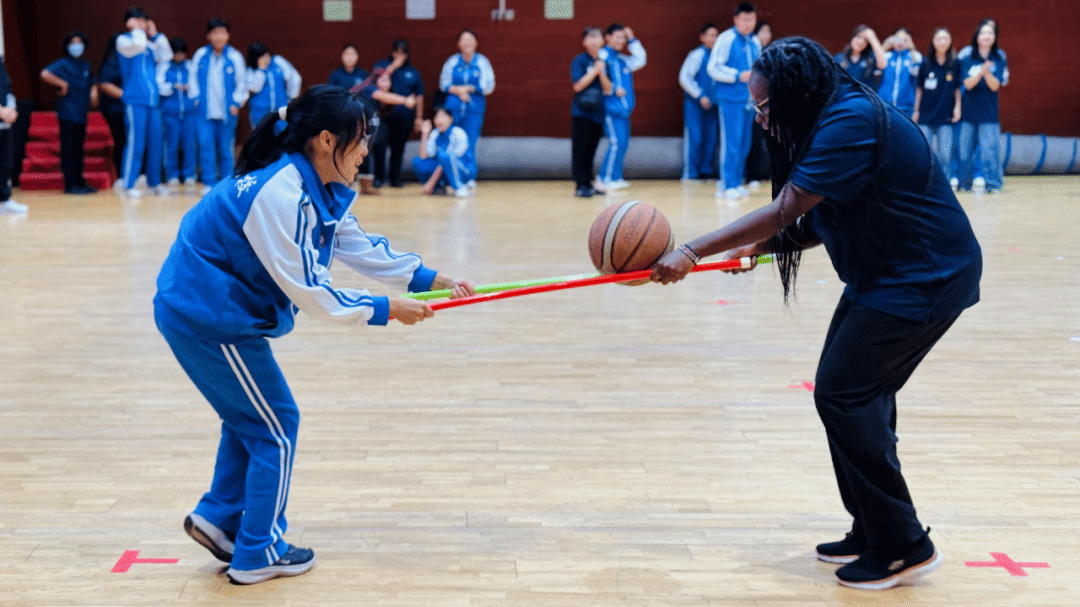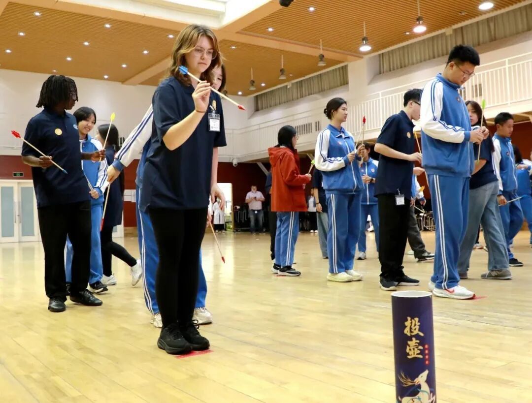 欢迎仪式结束后,中美学生共同参与了丰富多彩的互动体验。在皮影戏课堂上,光影交错间,《大闹天宫》的精彩演绎引来阵阵惊叹。美国师生、家长代表们亲手组装皮影、尝试表演,在协作中感受中国非遗的魅力。随后的趣味体育游戏环节,投壶、夹球接力、不倒森林等项目笑声不断。投壶区里,有人一投即中赢得满堂彩,也有人屡败屡战,在善意的笑声中收获鼓励;夹球接力赛中,中美学生两两搭档,起初步伐不一、皮球频频滑落,却在一次次尝试中逐渐找到节奏,击掌相庆时眼中满是默契的喜悦;不倒森林游戏中,围成圈的队员们全神贯注,随着口令同步移动、稳稳接住前一人的长杆,简单的游戏考验的正是彼此的专注与信任。运动场上欢笑声、加油声与掌声此起彼伏,传递着友谊的温度。