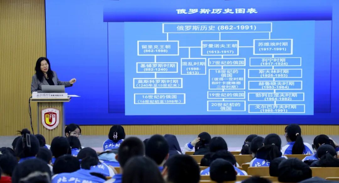 12月22日,北外附校融通大讲堂迎来了北京外国语大学俄语学院院长戴桂菊教授。戴教授以其在俄罗斯与斯拉夫国别研究领域的深厚学养,以“走进俄罗斯”为题,引领附校师生一同审视这个北方邻邦的地理轮廓、历史层理与文明特质,完成一次从表象认知到内在理解的探索。