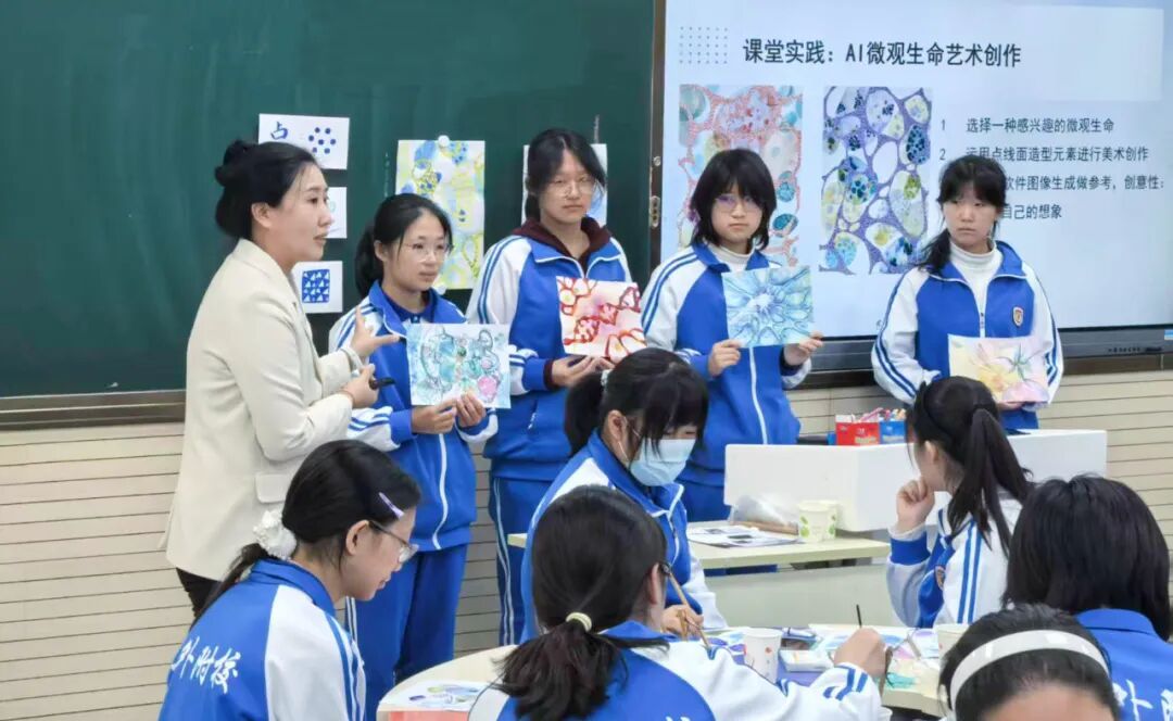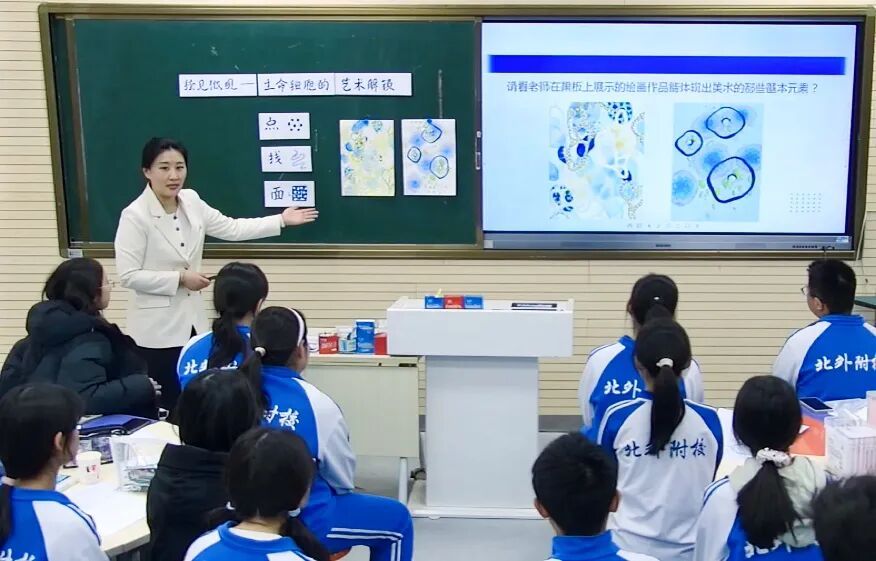 “我们身体里最小的生命单位是细胞,视频中细胞有哪些形状?”北外附校李寰老师以这样一个充满探索性的问题开启了《绘见微观——生命细胞的艺术解锁》课程。课堂上,李寰老师打破美术与生物学科的壁垒,构建了“科学认知—艺术表达—AI赋能”的完整教学链条,让学生在显微镜与画笔之间,发现看不见的世界之美。生物教师张晶通过录制视频的方式远程参与教学,精准讲解细胞的结构特征与生物学功能,李寰老师则引导学生将生物形态转化为点、线、面等艺术元素。在创作环节,AI技术更成为创意催化剂,学生们在手机中尝试输入指令,逐步调整参数,让画面更贴近自己的创作构想,实现了美术、生物与科技的有机融合。