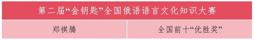 在第二届“金钥匙”全国俄语语言文化知识大赛中,郑祺腾同学在激烈角逐中跻身全国十强,荣获“优胜奖”;另一参赛选手许厚清同学虽未获奖,但在赛事中积累了宝贵经验,充分展现了北外附校俄语学子积极向上的良好风貌。