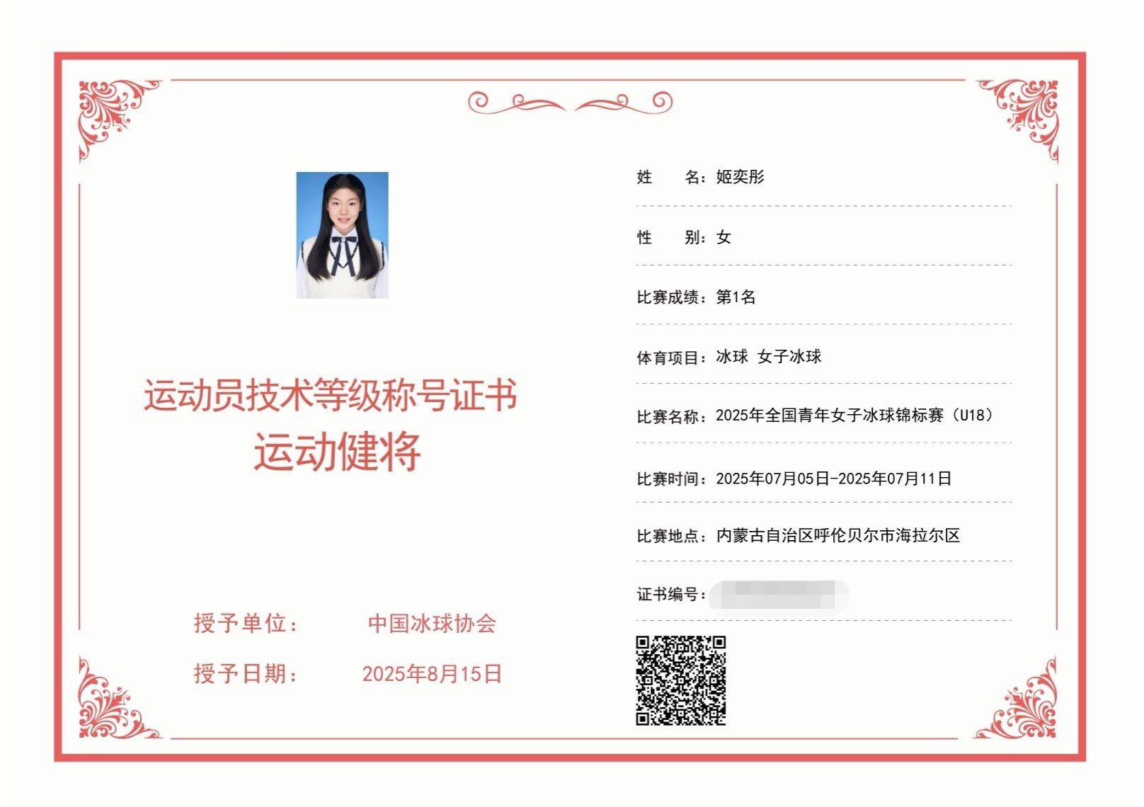 2025年7月,北外附校雪狼冰球队守门员姬奕彤同学身披86号战袍,以北京青年女子冰球队主力门将身份征战全国青少年女子冰球锦标赛。她凭借精湛技艺横跨U18、U16两个组别,助力北京队强势包揽双冠,个人两度荣膺“最佳守门员”称号,更以全场零封对手的卓越表现获评国家“运动健将”称号,成为本届赛事最耀眼的新星,为学校冰球项目书写了崭新历史。同年12月,我校高中冰球队(101集团队)远赴吉林参加2025年中国中学生冰球锦标赛,队员们不畏强手、敢打敢拼,在激烈角逐中脱颖而出,勇夺全国亚军,让北外附校冰球的强劲实力与团队风采在全国舞台上绽放光彩。