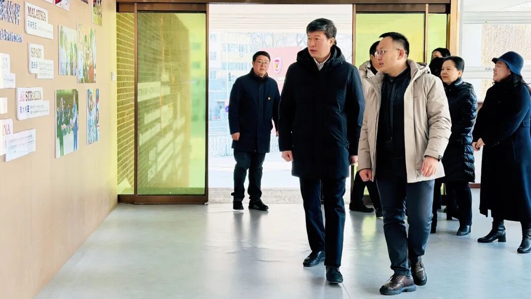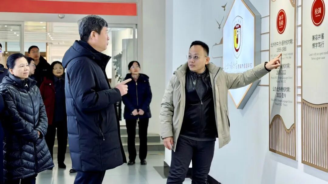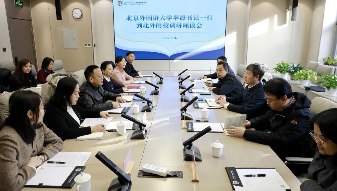 2026年1月26日,北京外国语大学党委书记李海一行赴北京外国语大学附属外国语学校调研指导工作。党委办公室、校长办公室主任岳洋,副主任彭澍陪同调研。在北外附校校长张文超、党总支书记张继军等陪同下,李海参观校园,听取工作汇报,全面了解学校课程教学、文化建设、教师队伍建设、安全工作等办学情况,对学校未来发展提出指导意见。