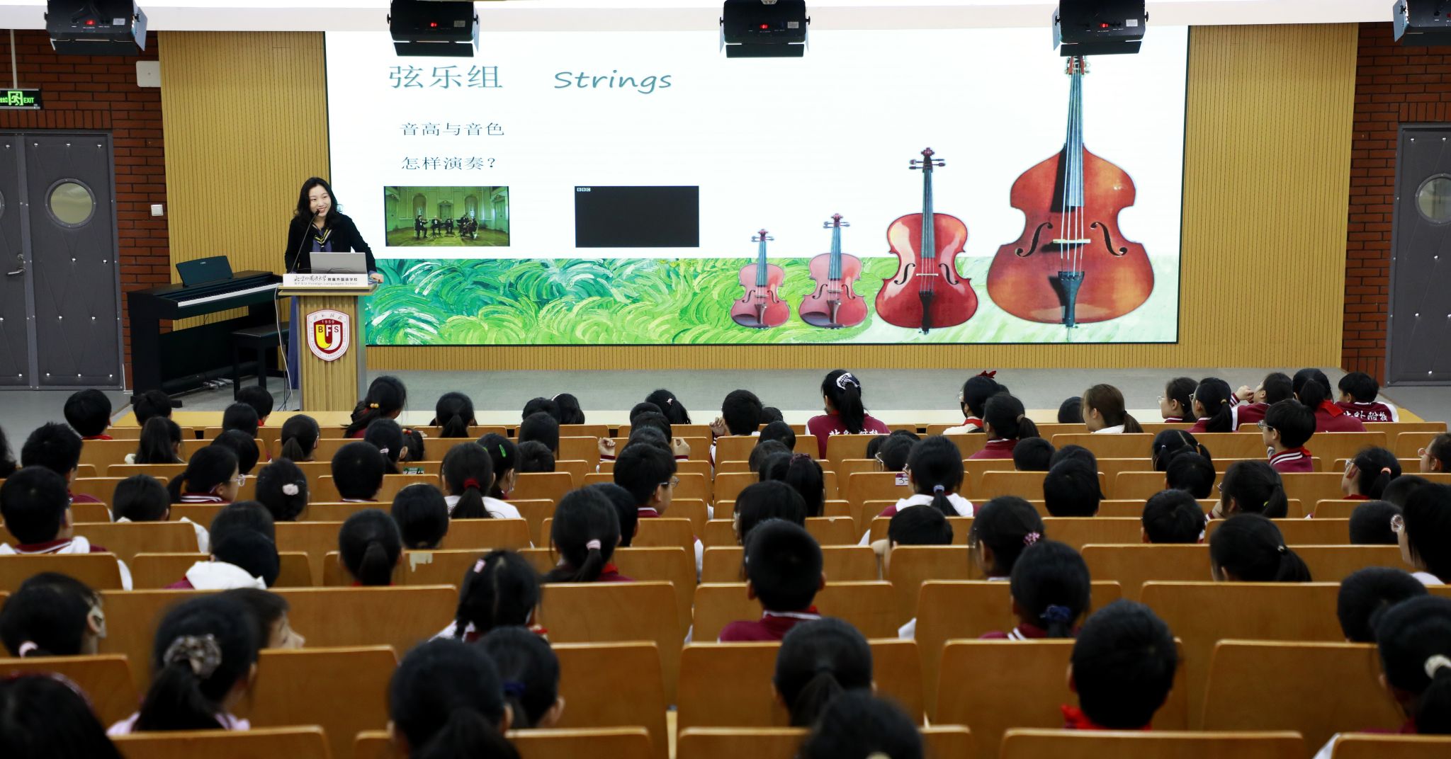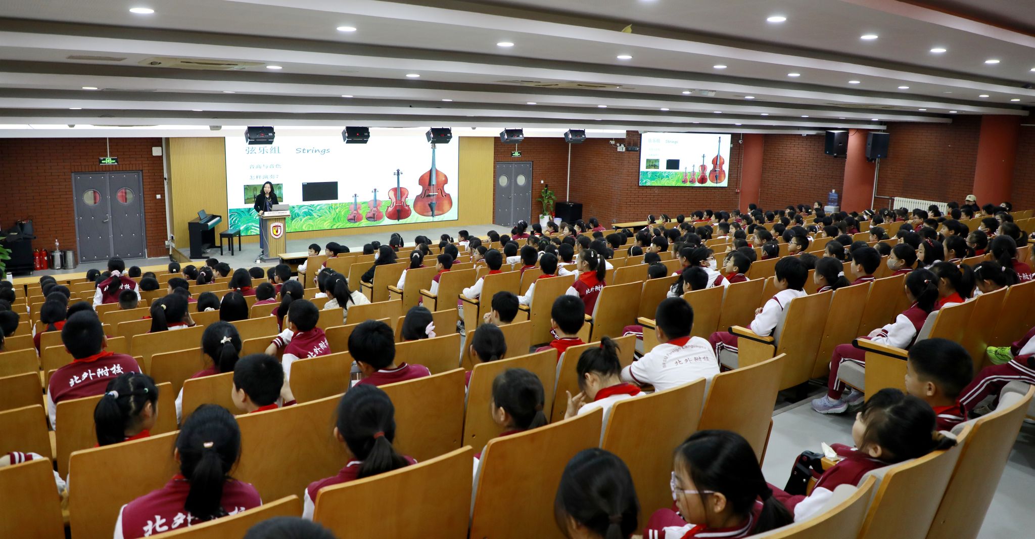讲座伊始,姜老师与同学们一同回顾了上一讲的内容。她用轻松活泼的提问方式,带领大家重温交响乐团的四大声部——弦乐、木管、铜管、打击乐,并再次以“声音王国”作喻,唤起孩子们对交响世界的记忆与好奇。同学们积极举手、踊跃作答,在轻松的氛围中巩固旧知。