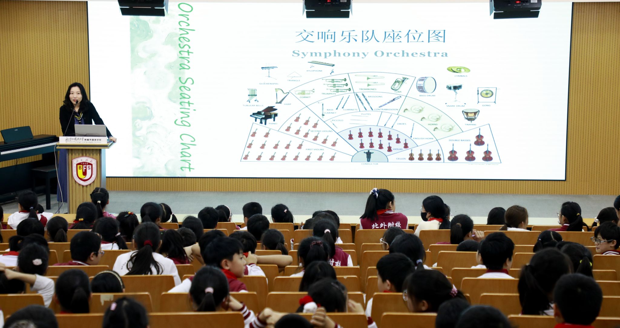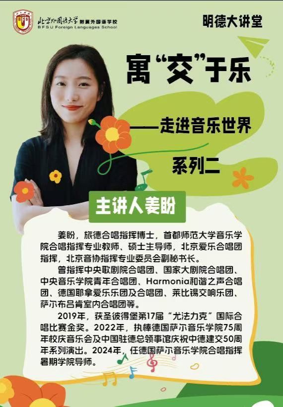 春和景明,乐约如期。3月17日,北外附校明德大讲堂再度开讲,迎来“寓‘交’于乐,走进音乐世界”系列讲座的第二讲。本次活动继续特邀旅德合唱指挥博士、首都师范大学音乐学院教师姜盼,带领同学们深入交响殿堂,解锁铜管与打击乐的奥秘。