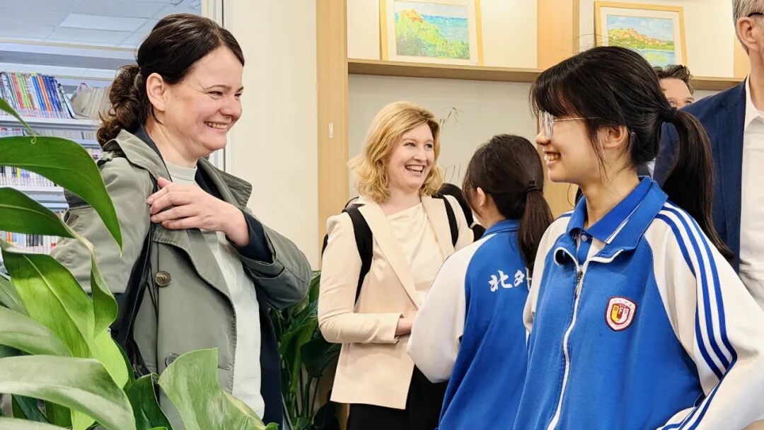 代表团还走进了初二年级的德语课堂。在主题为“在中国如何使用手机APP”的公开课上,北外附校师生全程使用德语互动,围绕网络购物、外卖点餐、打车、寄快递等日常生活场景开展情景式教学。学生参与踊跃,课堂氛围活跃,教学过程还融入了AI辅助手段。代表团成员表示,移动应用与人工智能在中国日常生活中的深度融合令人印象深刻,课堂所呈现的数字化教学场景也为他们提供了新的思考角度。
