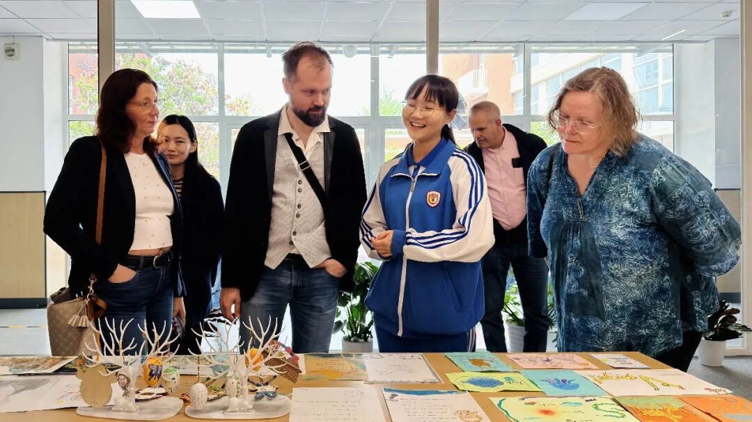 担任志愿者的德语学生在活动后也表达了各自的感受。高二(1)班杨墨涵同学专门创作了画作《友谊》送给代表团,将德国复活节彩兔与中国北京传统兔儿爷形象巧妙融合,寓意文化交融与情谊长存。她自己在德国出生、在中国长大,与德国代表团中一位有相似经历的校长聊得十分投缘,对方还留下名片,鼓励她日后赴德深造。高二(1)班许默然同学说,德国校长们的亲切随和给她留下了深刻的印象。在她讲解作品展的过程中,校长们始终专注聆听,并给予她许多鼓励与肯定,这段经历让她备受鼓舞,也更加坚定了学好德语的决心。