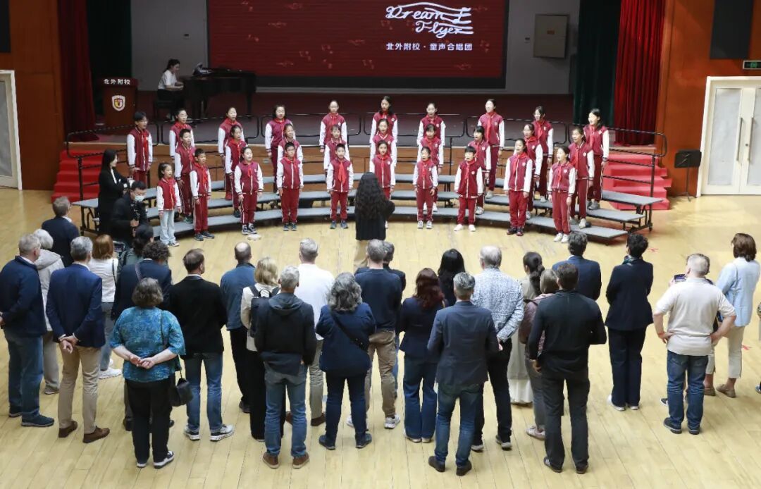 在北外附校师生的陪同下,代表团一行先后观摩了学生合唱团复语音乐课堂、小学生阳光跑体育活动,并参观了校园主要教学与生活设施。合唱团演绎的德语歌曲《乘着歌声的翅膀》与西语歌曲《埃尔维托》令人意犹未尽;操场上,孩子们步伐整齐、精神饱满,脸上洋溢着自信的笑容,纷纷向来宾挥手问好。在教师书吧,代表团观看了学生德语作品及教学成果展示,高二(1)班许默然同学以流利的德语向来宾介绍了冬奥主题手抄报、德语原创诗歌、创意字母设计及复活节文化艺术品等特色展陈,其专业的讲解与自信的风采赢得了代表团成员的频频赞许。