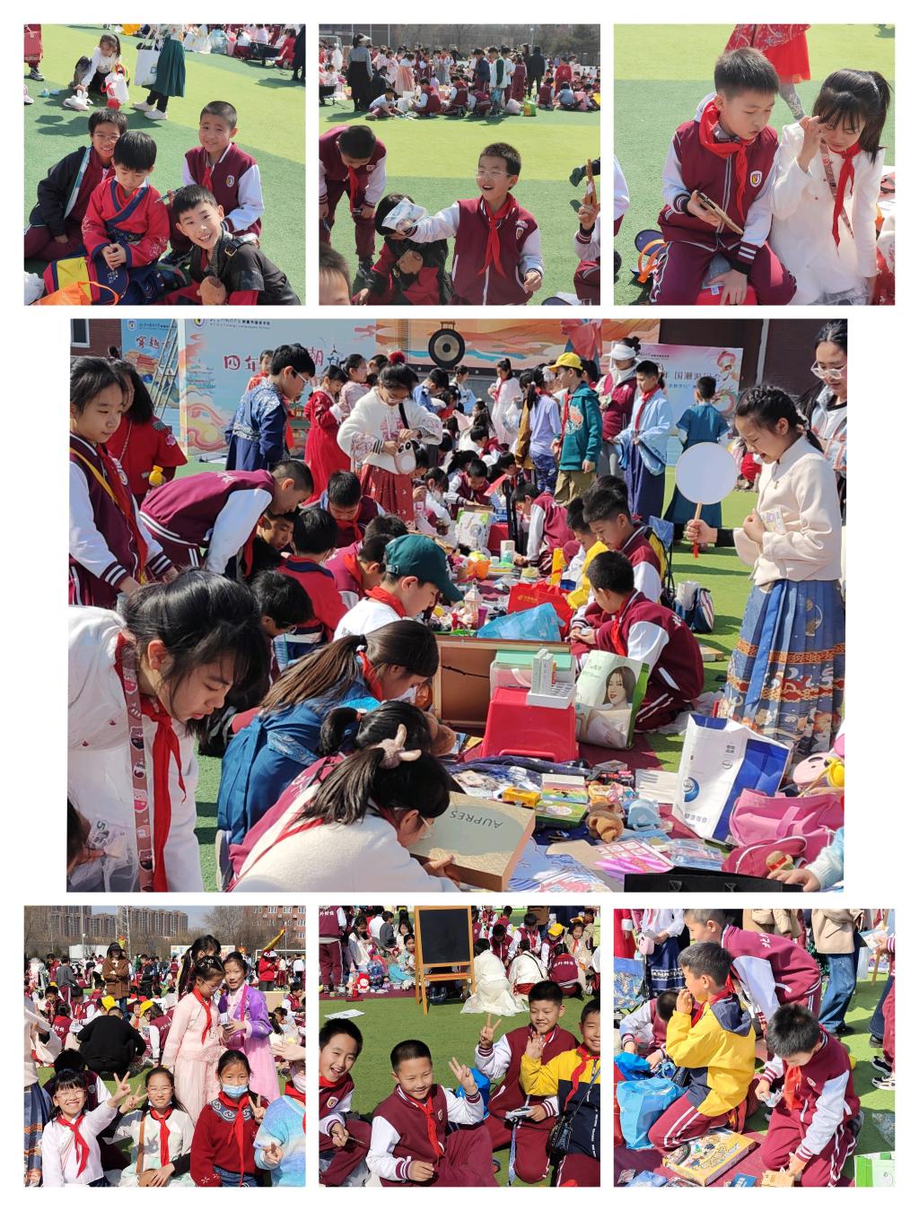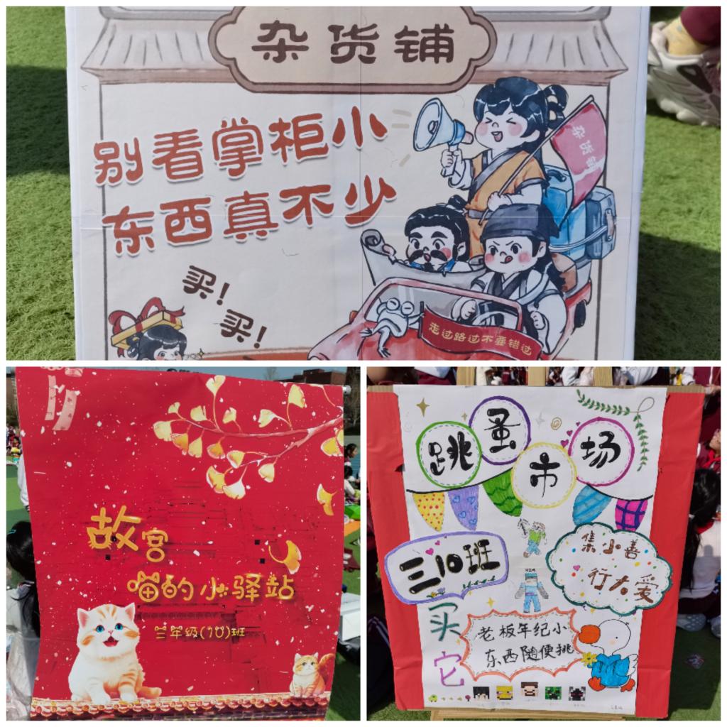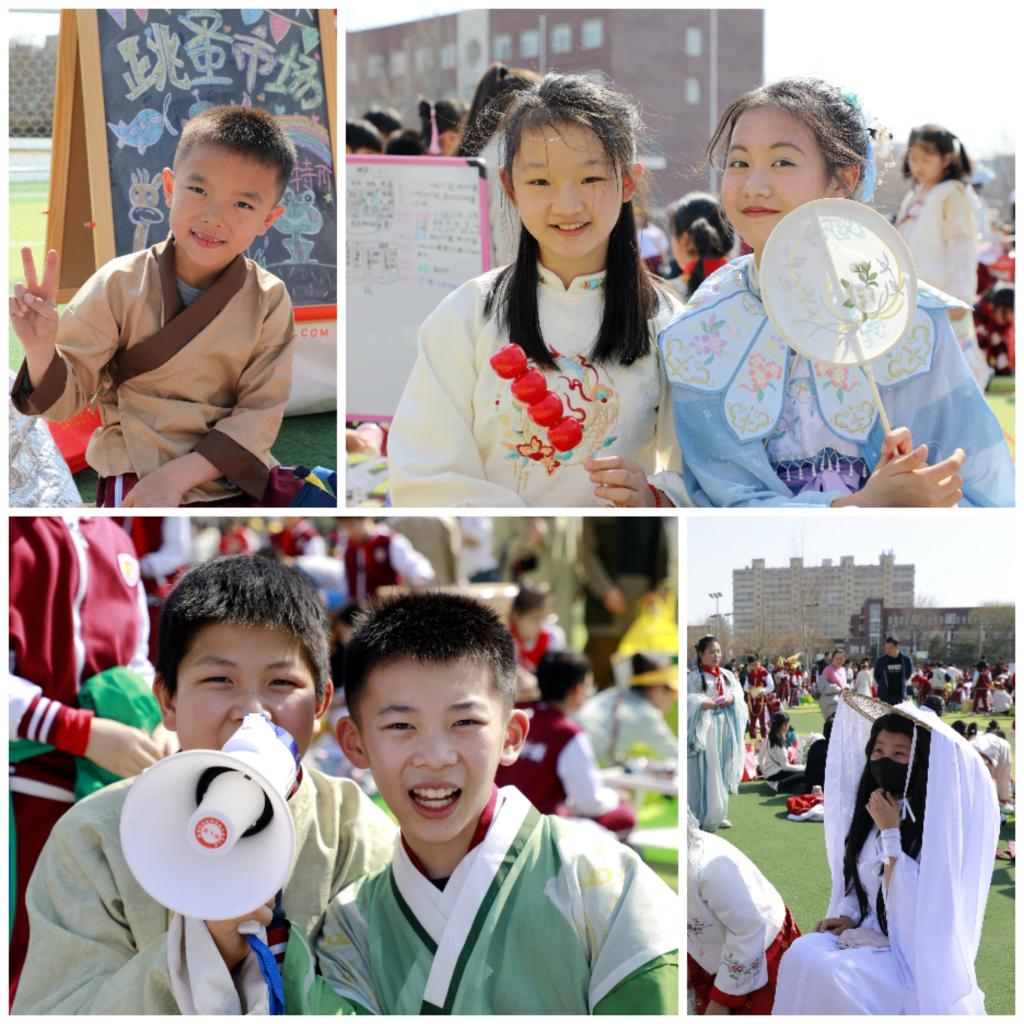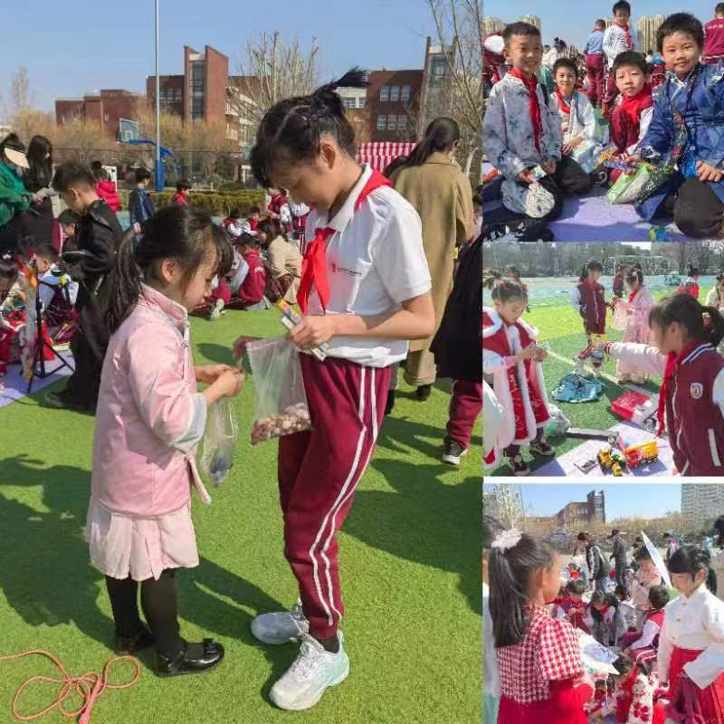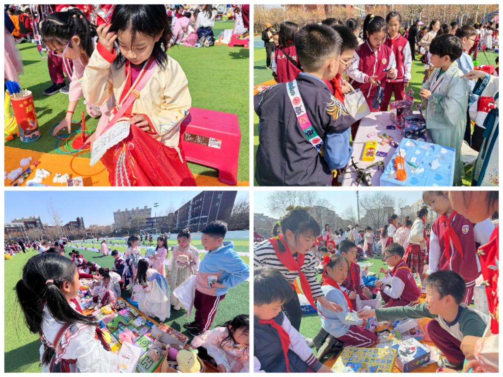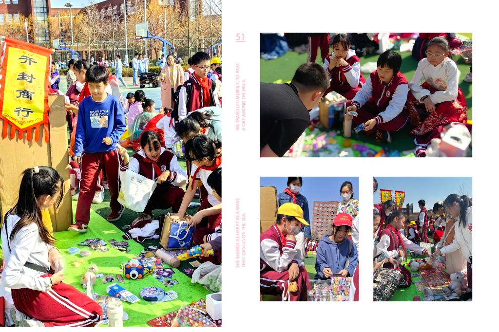 π节当日,一场别出心裁的国潮市集跳蚤市场活动在北外附校操场热闹开市。“5、4、3、2、1,咣----”在同学们的欢呼声中,课程教学中心主任王静敲响了跳蚤市场的铜锣,“国潮市集”开集啦!整个市场沸腾起来。活动现场人头攒动,热闹非凡。丰富的书籍、新奇的玩具、漂亮的饰品、实用的学习用品……应有尽有。身着汉服的小客人穿梭于各个摊点间,挑选着自己心仪的物品,小摊主们做起生意来有模有样,他们用满腔的热情服务着每一位“顾客”,并用在课堂上学到的数学知识与他们“讨价还价”。摊主们想尽一切办法推销商品,有的“主动推销”,有的“捆绑销售”,有的“买物赠礼”,还有的做起了“流动商贩”,开始了“沿街售卖”……热闹的跳蚤市场,响亮的吆喝声、创意十足的宣传画、喧闹的询价声,响成一片。此次国潮市集设计了汉、魏晋、唐、宋、明、清六个主题朝代,从国风服饰到国风宣传海报,从国潮特色摊位到传统文化展示活动,处处彰显了传统文化与现代元素的巧妙结合。