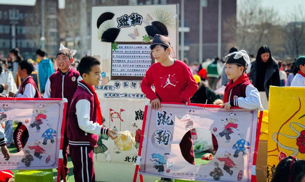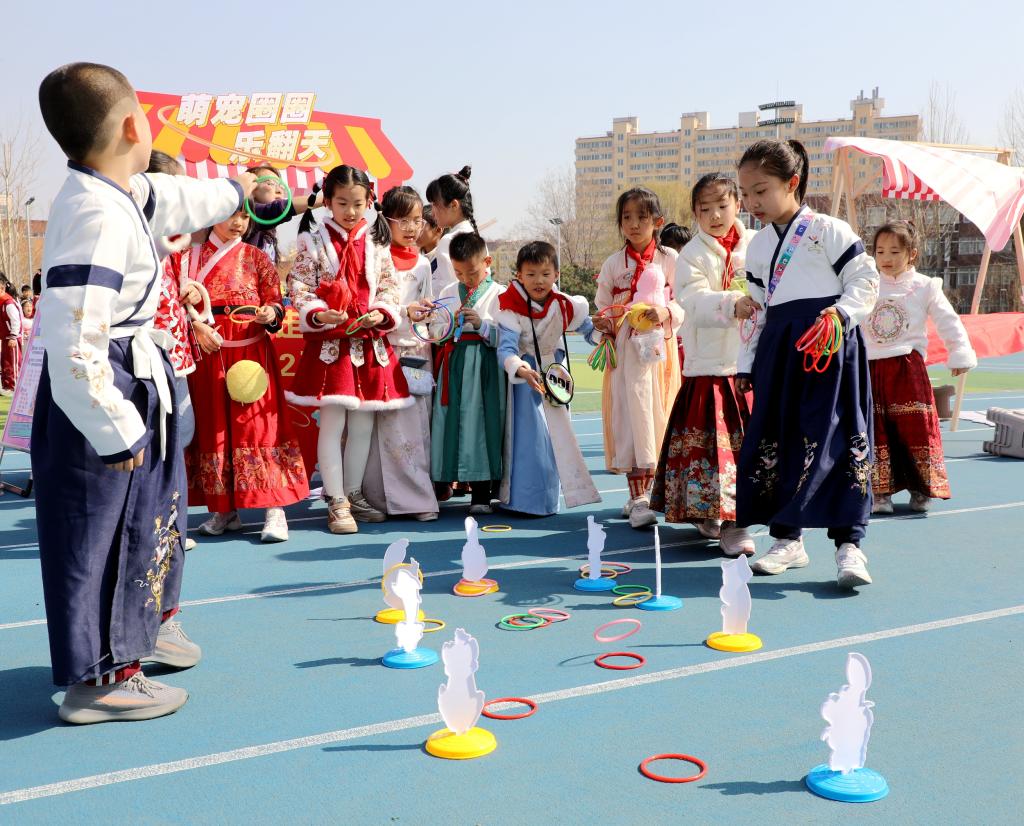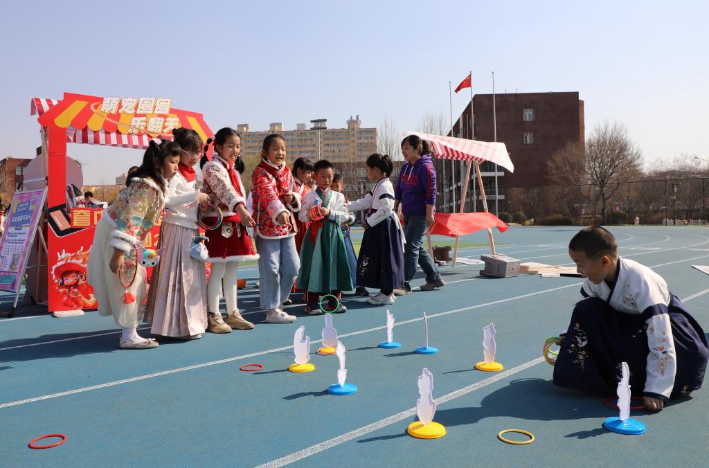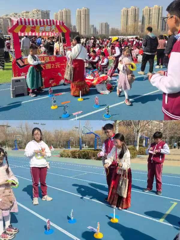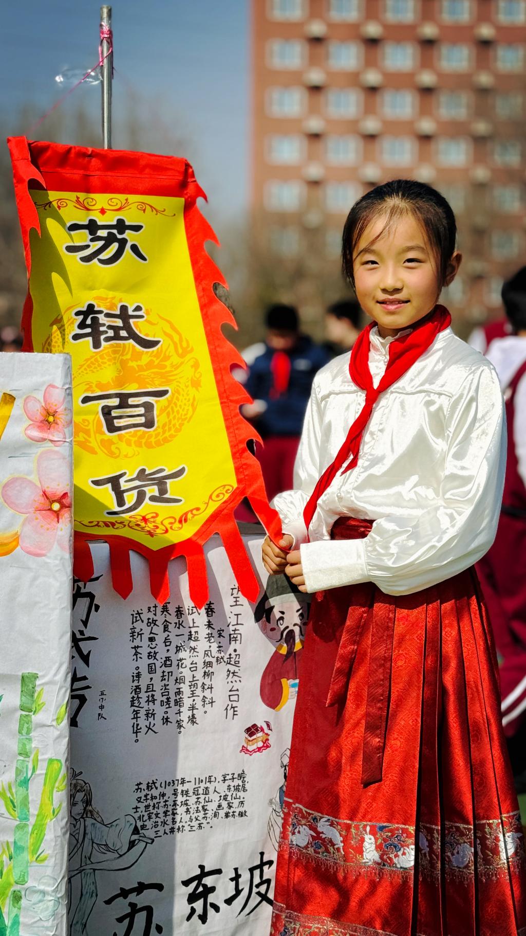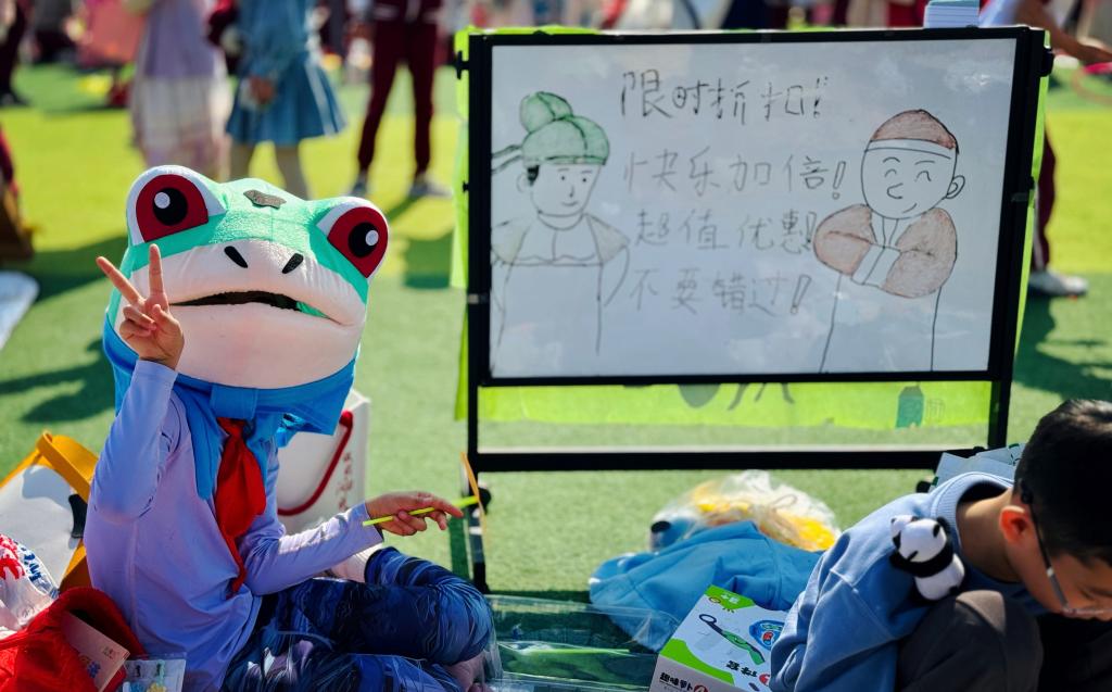 π节当日,一场别出心裁的国潮市集跳蚤市场活动在北外附校操场热闹开市。“5、4、3、2、1,咣----”在同学们的欢呼声中,课程教学中心主任王静敲响了跳蚤市场的铜锣,“国潮市集”开集啦!整个市场沸腾起来。活动现场人头攒动,热闹非凡。丰富的书籍、新奇的玩具、漂亮的饰品、实用的学习用品……应有尽有。身着汉服的小客人穿梭于各个摊点间,挑选着自己心仪的物品,小摊主们做起生意来有模有样,他们用满腔的热情服务着每一位“顾客”,并用在课堂上学到的数学知识与他们“讨价还价”。摊主们想尽一切办法推销商品,有的“主动推销”,有的“捆绑销售”,有的“买物赠礼”,还有的做起了“流动商贩”,开始了“沿街售卖”……热闹的跳蚤市场,响亮的吆喝声、创意十足的宣传画、喧闹的询价声,响成一片。此次国潮市集设计了汉、魏晋、唐、宋、明、清六个主题朝代,从国风服饰到国风宣传海报,从国潮特色摊位到传统文化展示活动,处处彰显了传统文化与现代元素的巧妙结合。