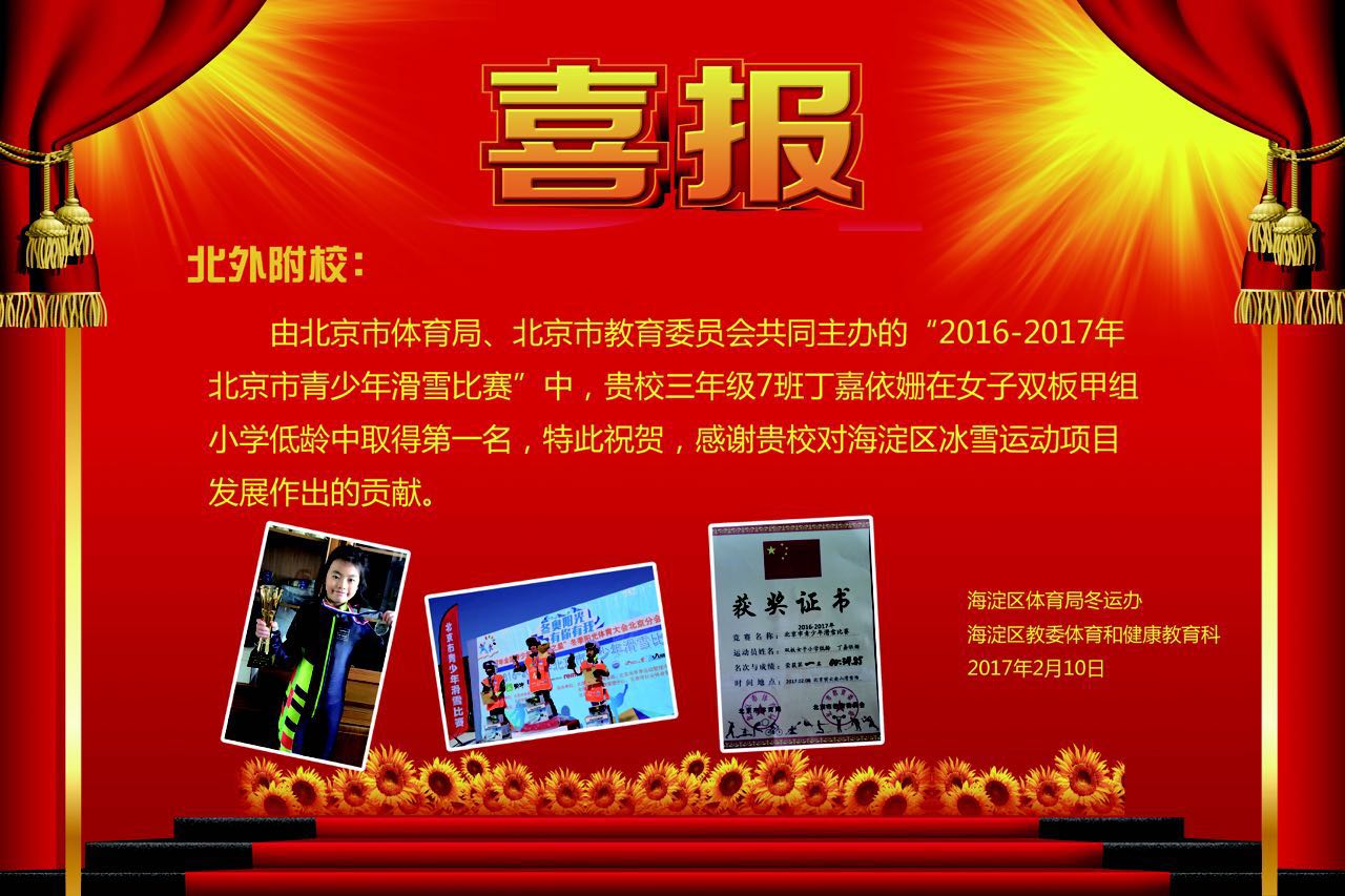 由北京市体育局、北京市教育委员会共同主办的“2016一2017年一北京市青少年滑雪比赛”中,我校三年级7班丁嘉依姗在女子双板甲组小学低龄中取得第一名的优异成绩。