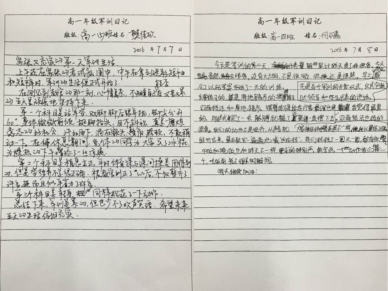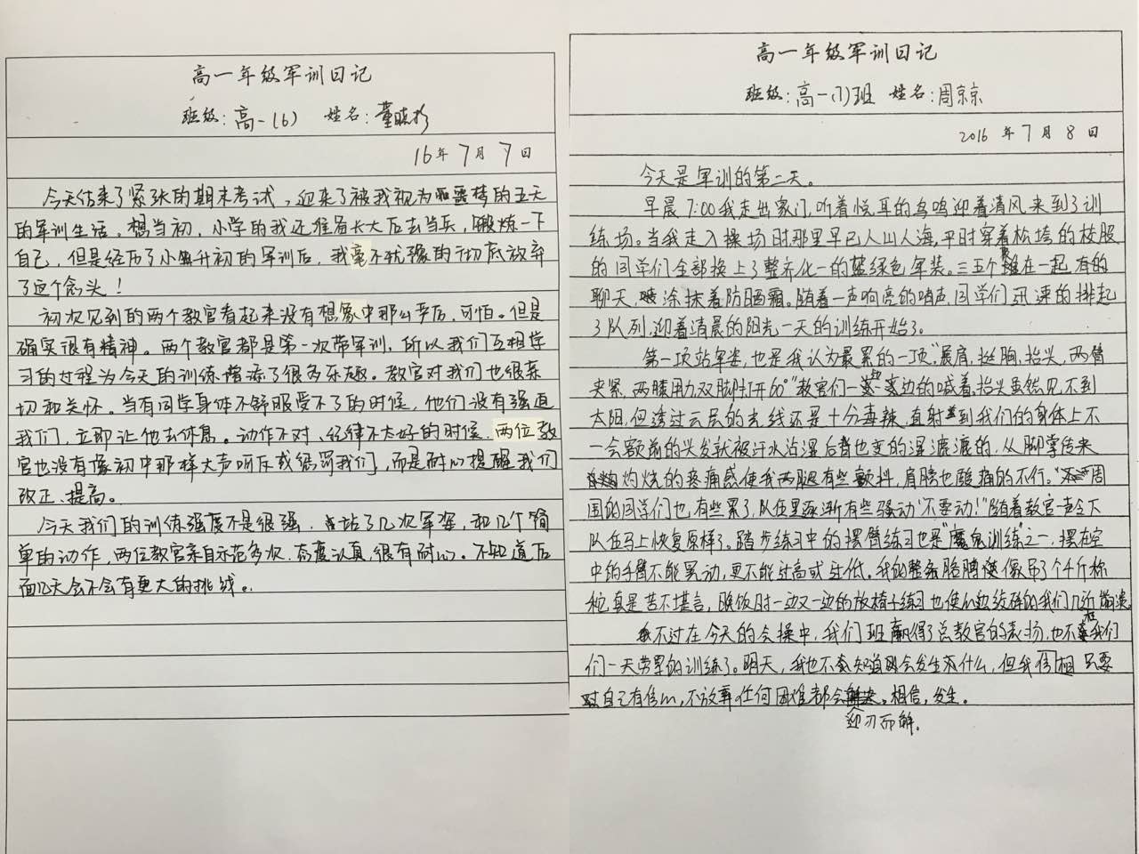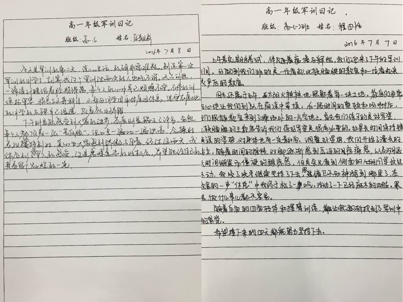 今天是军训的第三天,军训的每一天,同学们都会在晚自习时写一篇军训日记,分享自己紧张而又充实的生活。从前两天的军训日记中,可以看出同学们对军训生活从有些抵触,到慢慢接受,再到现在的受益匪浅,经历了漫长的心理和生理的考验。即使每天的训练都使大家疲惫不已,但他们在每天的日记中仍写下对明天的期待,他们也清楚地意识到了这次军训的意义,以及老师、教官的苦心。他们懂得了什么叫集体,什么叫坚持,增强了组织性、纪律性和集体荣誉感,努力向教官看齐。相信今后他们将把军人严谨的作风带到学习和生活中去,严于律己,奋发图强,以更加积极向上的心态,去迎接未来不可预知的挑战。