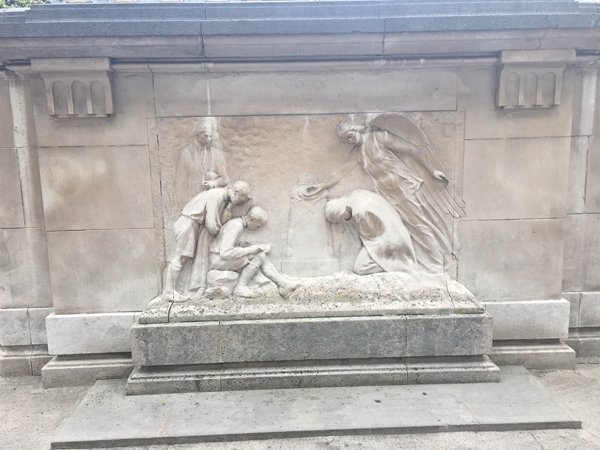 这是校园内一幅将近百年历史的石雕,一位已经牺牲的少年在安慰自己的母亲