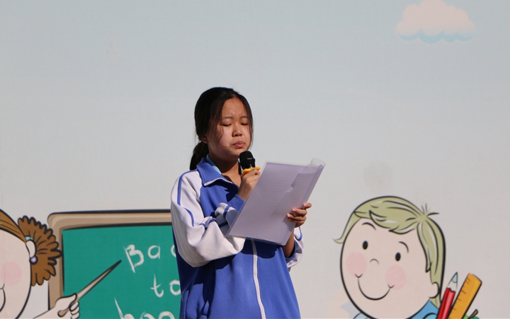 张译禅同学作国旗下发言。在发言中,她引用卫生监督部门的数据,从校门口周边小店卫生状况堪忧说起,呼吁同学们强化食品安全意识,培养良好的饮食习惯,不购买三无食品,不吃街头无证小贩食品,尽量在家用餐,养成健康、科学的生活习惯。