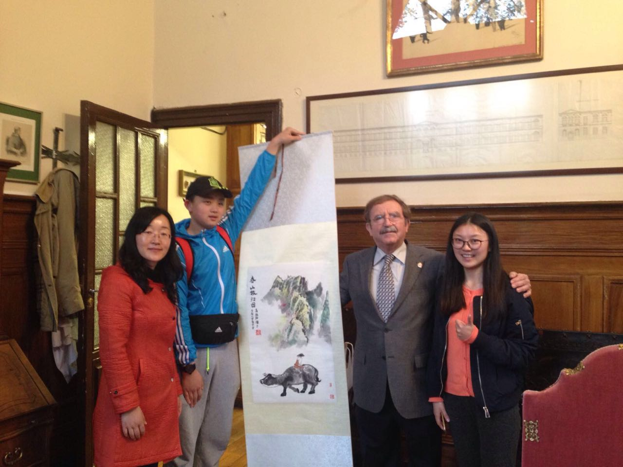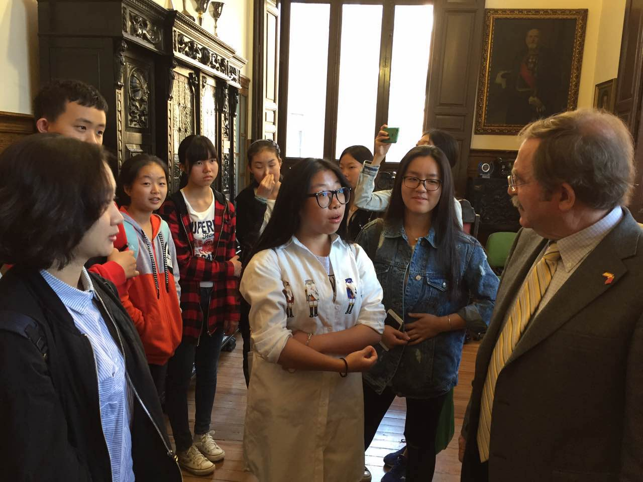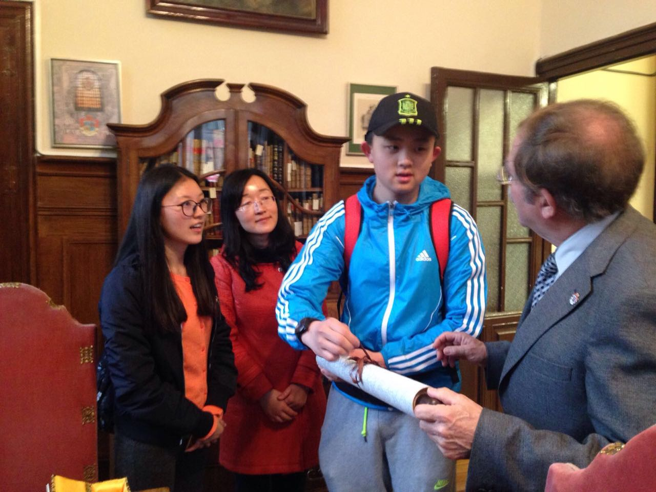 在与小伙伴共度了三天的假期之后,我们随同小伙伴一起返校,由Maria带我们参观了学校。希斯内罗丝中学是一所很古老的中学,现在是马德里老牌的公立校,培养了许多优秀的人才。到达学校后有许多匆匆而过的学生穿过大门,登上了学校的楼梯。学校的楼梯有着深刻的教育意义,意味着从人生的初始到结束,教育贯穿一生。然后我们参观了走廊和历史悠久的教室、办公室和图书馆。值得一提的是,图书馆里还保存着原版图书和教具。从中我们可以看出在两三百年前,西班牙教育的缩影及其发展。在参观学校后,我们欣赏了三位希斯内罗丝中学学生的钢琴表演,十分精彩,双方校领导致辞,并交换礼物。
