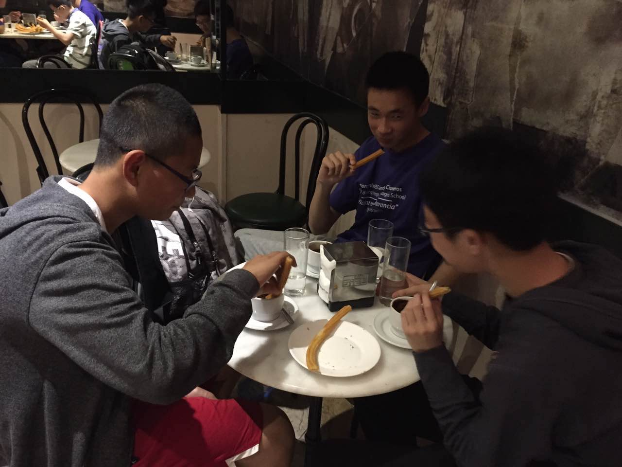 教授带我们穿街走巷,来到了一家店前,进去后才知道那是西班牙的特色美食——churros。那是一个类似于中国油条,并要蘸着热巧克力吃的美食。