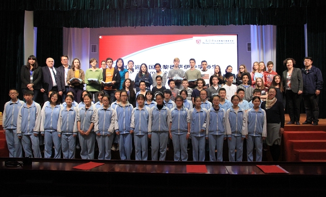 4月8日早上,姊妹校法国巴黎德萨伊中学师生一行29人来访我校。11日中午,我校为远道而来的法国师生交流团举行了隆重的欢迎仪式。北京外国语大学校长助理、北外附校校长林卫民,北外附校校长助理、初中副校长杨磊,初中副校长许祥,初中法语组老师及初一、初二法语学生参加了本次活动。