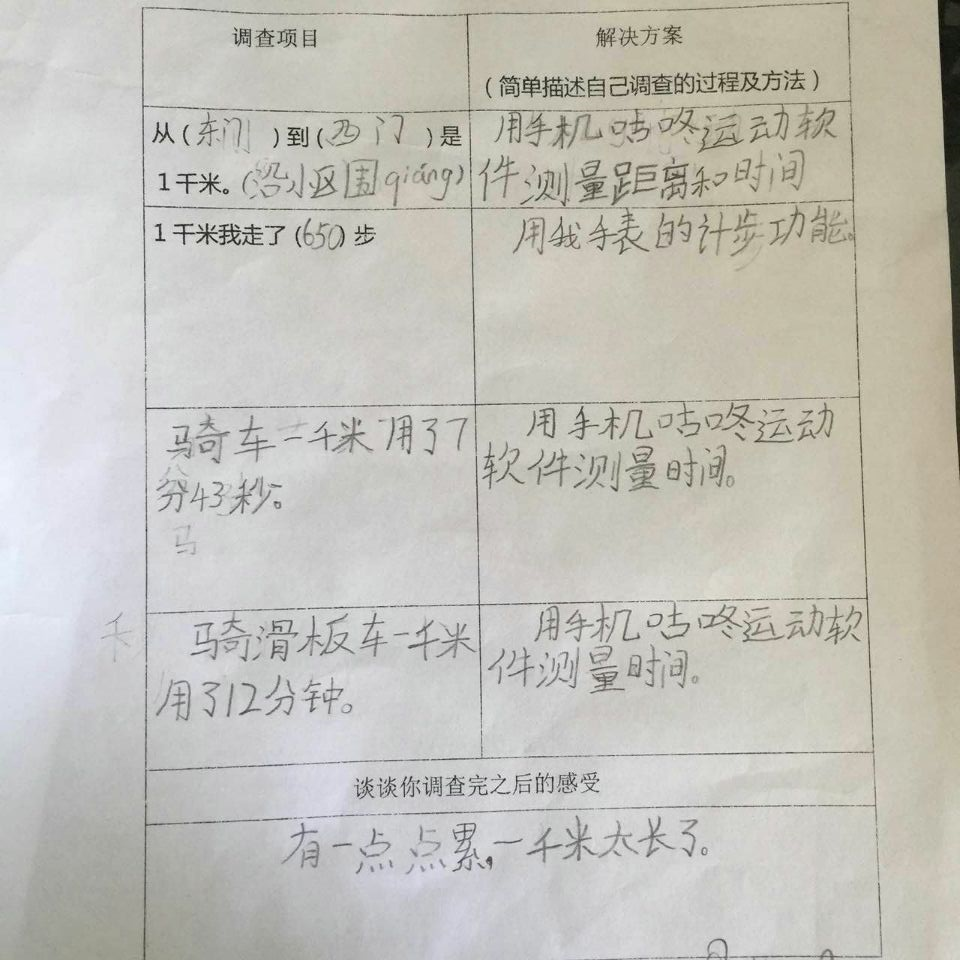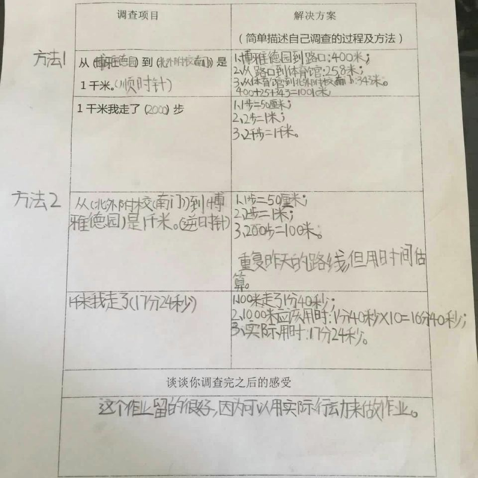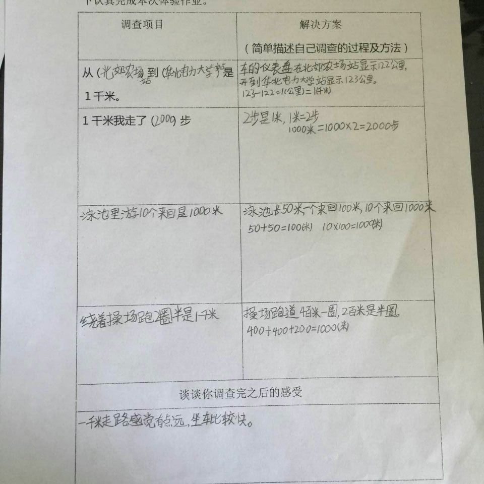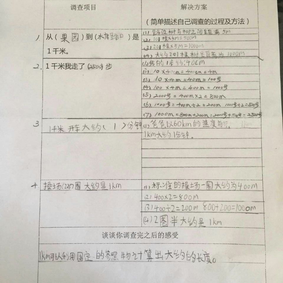 面对这样的实践作业,孩子们都觉得特别有意思,每一个同学都用自己的亲身经历体验到了学习数学的乐趣。孩子们惊奇地发现,原来一千米跟自己之前想象的大有不同:有些同学在调查之前觉得一千米等于1000米,有1000个一米长应该很长很长,而通过本次数学实践作业调查后,发现家附近的超市离自己家大约就是一千米,原来一千米没有想象的那么远,爸爸开车的话甚至一分钟就开到超市了,原来开车一分钟就可以走完一千米呢。有些同学在调查之前觉得一千米大概只有操场的三圈,应该不会太长,但自己步行一千米之后发现走一千米的路真的很累。孩子们通过亲身感受,在生活中重新认识了一千米,并且将数学知识与生活实际紧密结合,从而真正感受到了学习数学的乐趣与意义。