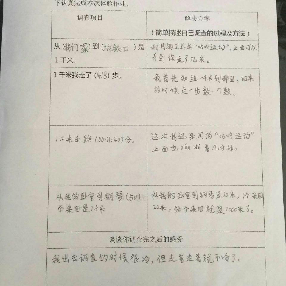 数学作业是课堂教学的延伸和拓展,是对数学知识的巩固和运用,是小学数学教学的重要组成部分。著名教育家陶行知说:教学做要合一,在做上学,做是学的中心。因此,在数学教学过程中,根据教材特点,多为学生搭建实践活动的平台,让学生在实践中学习、在实践中合作、在实践中创新是很有必要的。基于此,在清明小长假期间,二年级数学组给孩子们留了一个有意思的数学实践作业“体验一千米有多长”。