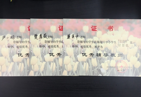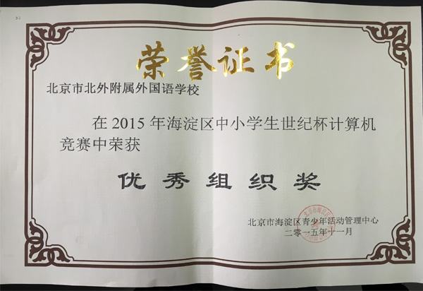 我校小学科学组教师燕英中、贾晨薇、尹小楠辅导学生参加了每年一次的“北京市海淀区中小学生科技世纪杯计算机比赛”,继续取得佳绩,共有25名学生作品获奖,其中,一等奖3人,二等奖12人,三等奖11人;北外附校在本次竞赛中荣获“优秀组织奖”。