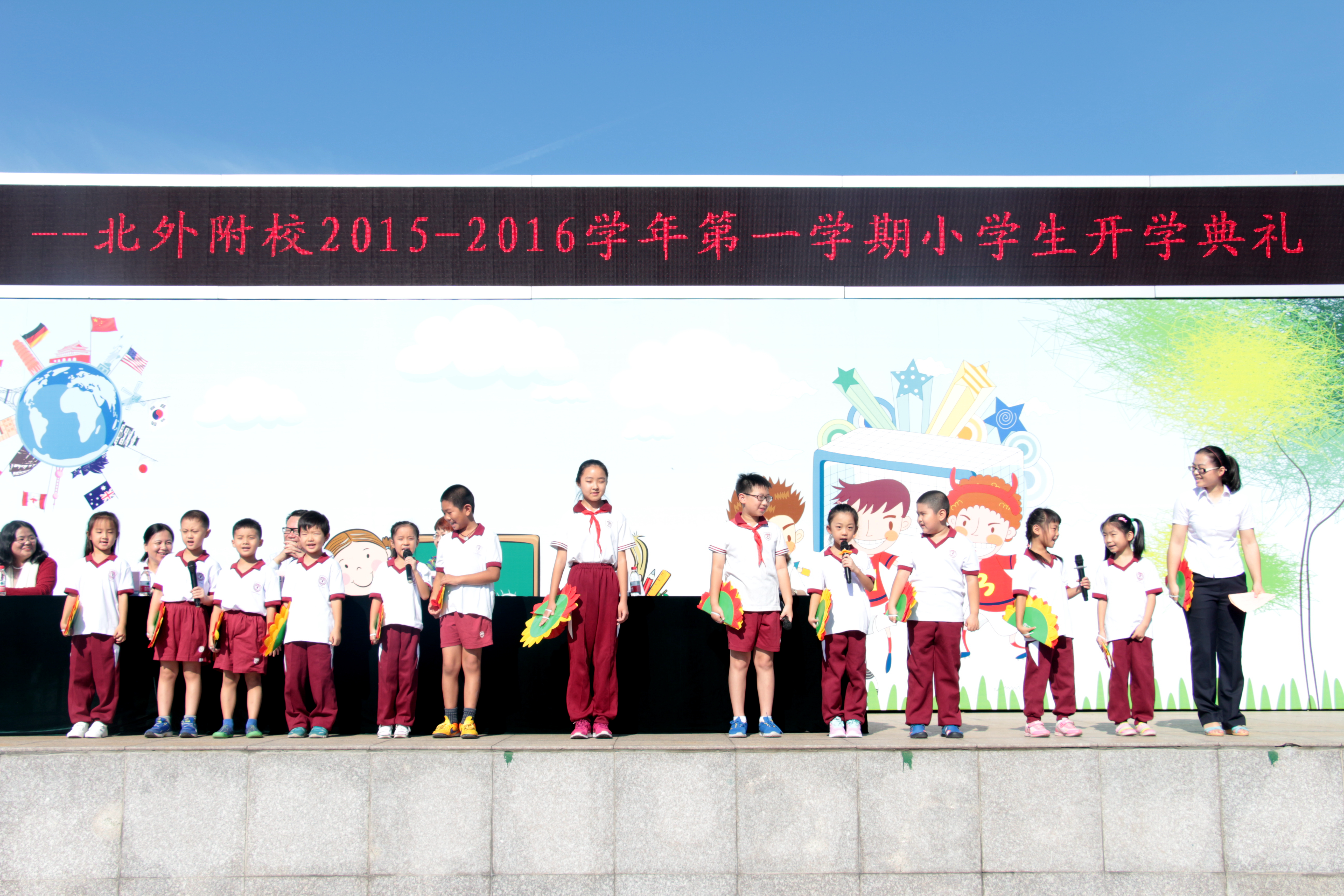 9月7日,我校隆重举行2015-2016学年第一学期小学生开学典礼。参加此次活动的领导和嘉宾有:北京外国语大学校长助理、北外附校校长,研究员、特级教师,林卫民;北外附校常务副校长兼高中校长、副教授王彤,副校长兼初中校长张继军,副校长、副书记兼培训学校校长高雁鸣,副校长兼小学校长于苒;董事会秘书、总务处主任苑雪芳;家长代表姚胜和部分学生家长。典礼以“铭记历史,明天,你好!”为题,由小学副校长孟娜主持。