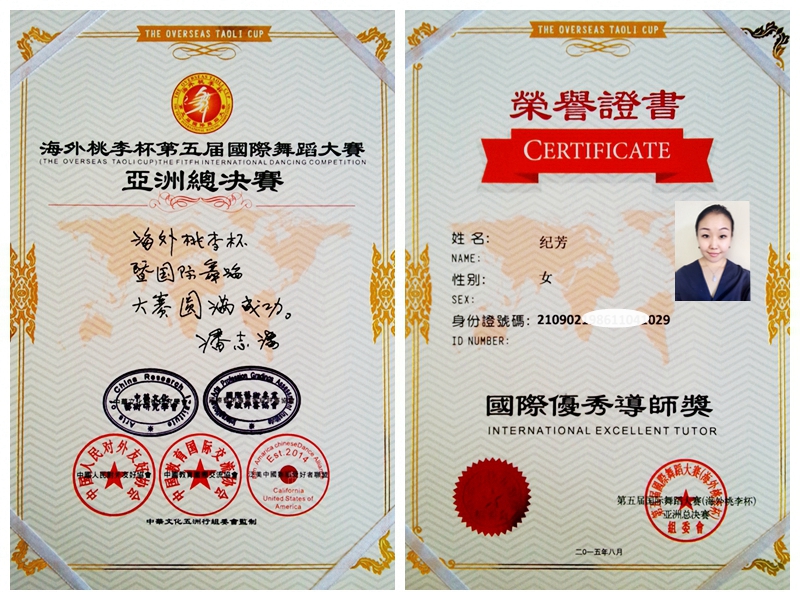 图为我校艺术中心总监纪芳老师获海外桃李杯亚洲赛区总决赛国际优秀导师奖的证书