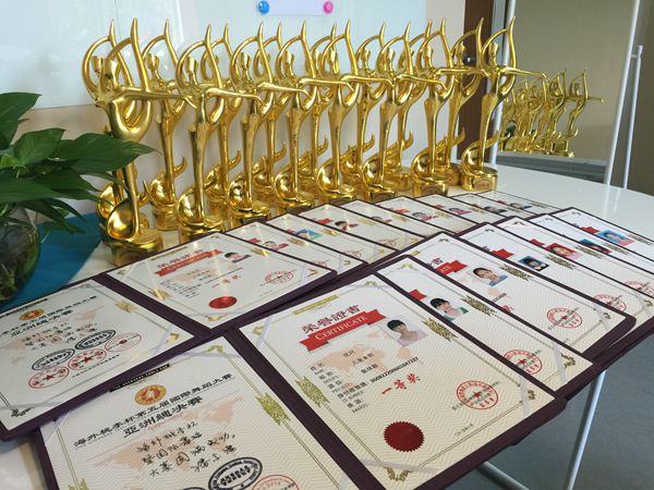 图为舞蹈作品《花是花》获得的海外桃李杯亚洲赛区总决赛少儿组金奖奖杯和证书