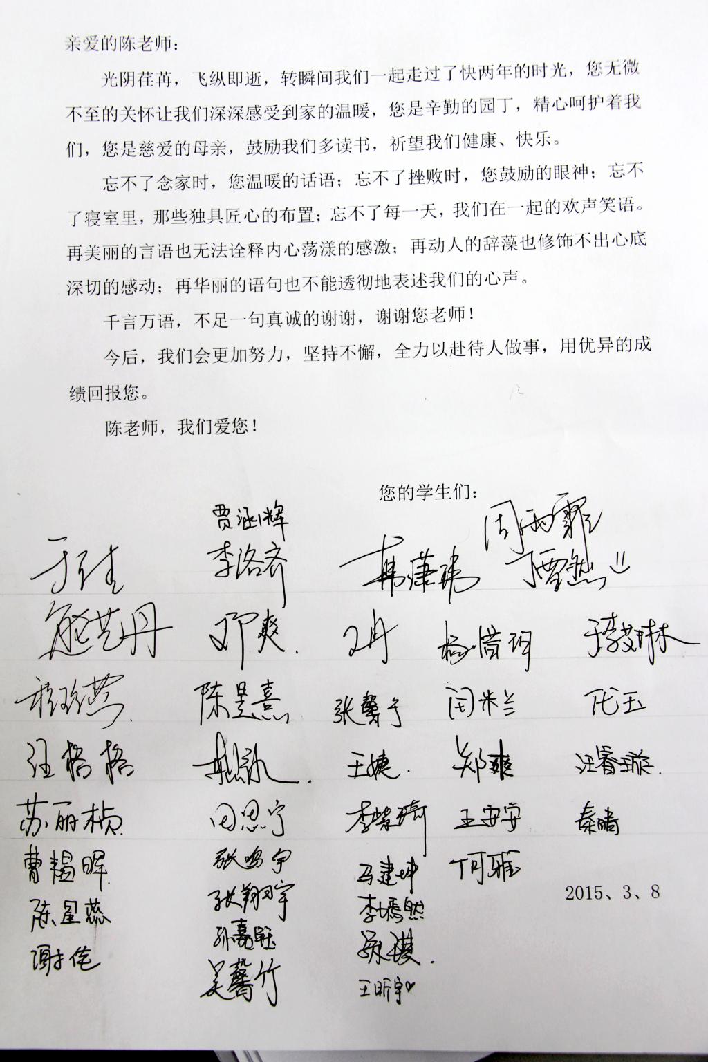 3月8日,在这个特殊而又有纪念意义的日子里,高三的女生们为她们的生活老师陈秀艳,送上了一份特别的礼物——全体女生亲笔签名的感谢信。这是孩子们第一次用最简单的方式表达对师恩的感谢和对宿舍之家的眷恋。