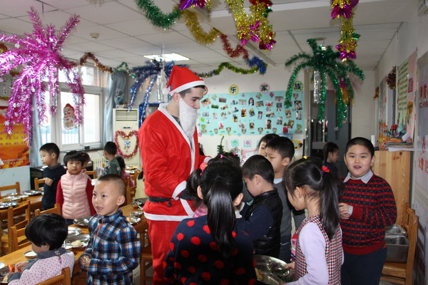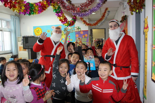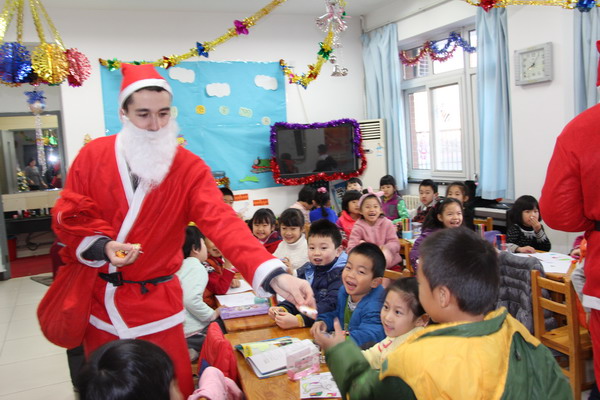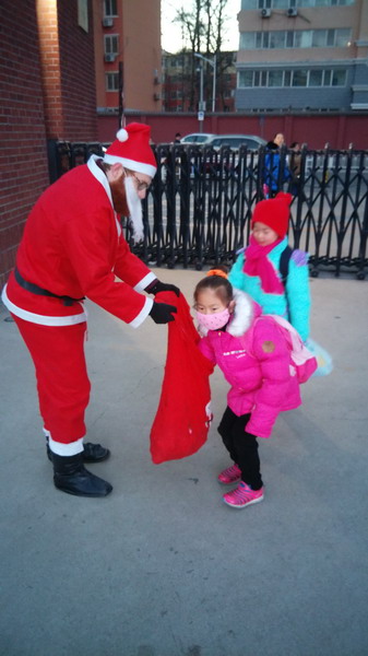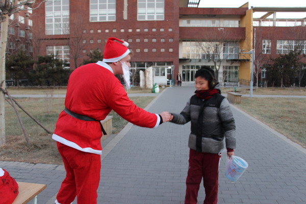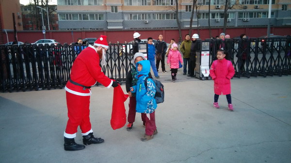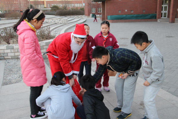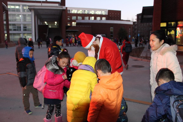外籍教师们穿上圣诞老人的节日服装,为前来上学和上班的师生们送上“Merry Christmas!”的圣诞寄语并赠送糖果,孩子们非常兴奋,也纷纷大声用流利的英文向外教们致谢,追随、拥抱外教并合影留念。校园里充满了欢乐的节日气氛,每位师生都绽开幸福的笑容。