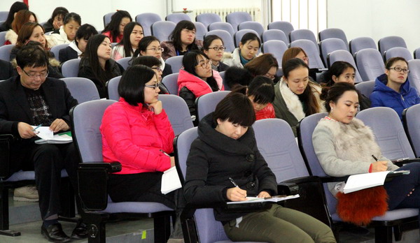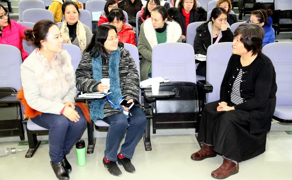 付教授以英语课堂导入的原则作为切入点,把自己多年的实践心得与教师们分享,她强调教师一定要善用方法让每一位学生参与到课堂中,充分调动学生的发散性思维,为学生设立小目标从而进行高效的小步教学,教学目标的设置要合理,让学生不断体验到学习的成就感,并且要努力为学生创设情景教学,让孩子体验真实生活。付教授的讲述诙谐幽默,以互动式的教学方法,邀请老师们积极参与模拟活动,亲身设计活动,吸引了全体英语教师,讲座充满欢乐,氛围融洽。这次讲座让全体英语教师对今后的教学策略和目标有了更加明晰的认识与把握。