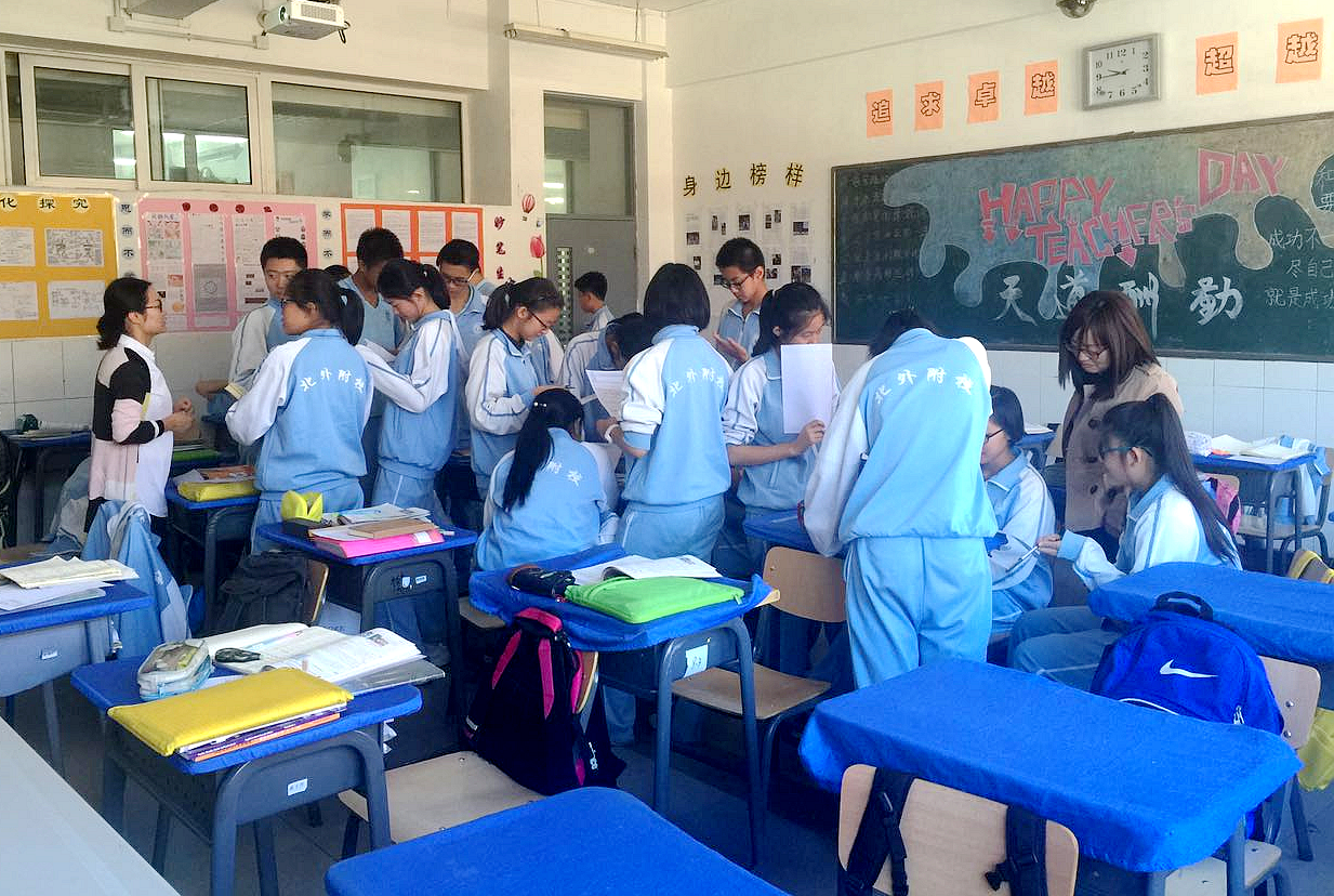 李斯莲、刘小红老师通过和师生们的座谈,同初中英语教研组长刘娟就教学、教研、学生活动等情况的交流,对我校的外语特色建设有了更深入的了解。