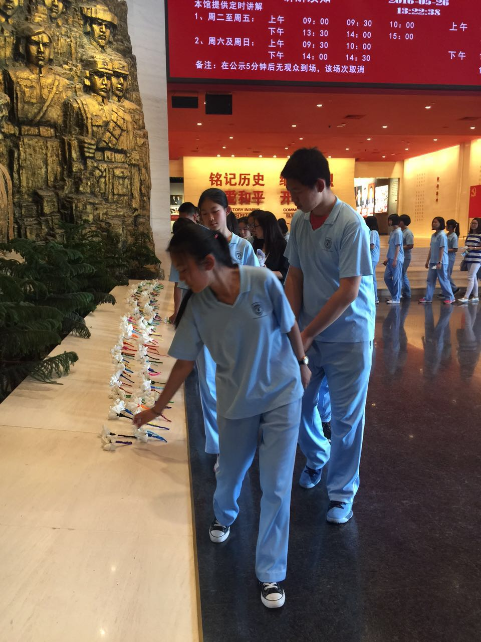 进入纪念馆,同学们整齐地站成了一个方阵。首先,在老师的带领下,同学们面向国旗,庄严唱响中华人民共和国国歌。站在五星红旗旁,同学们举起右拳郑重宣誓。“铭记历史,缅怀先烈,珍爱和平,开创未来”,整个广场回荡着大家气势磅礴的声音,久久不能停息,这其中既有同学们满腔的爱国热情,更饱含我们誓要奋发图强、振兴中华的决心和信念。