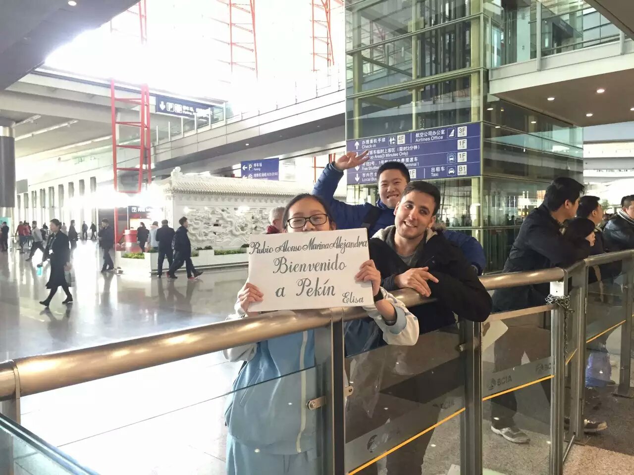 我校西语外教Adrián与初二西语班学生代表李婧文、谢迪哲赴机场迎接西班牙小伙伴