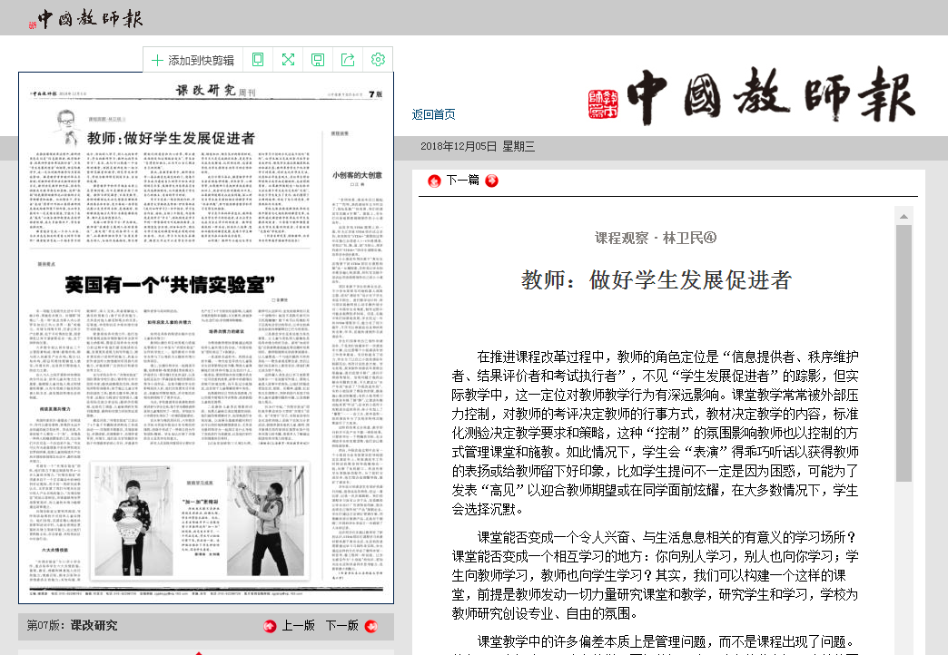 12月5日,《中国教师报》第七版(课改研究周刊)连载刊登我校林卫民校长署名文章第4篇《教师:做好学生发展促进者》,全文如下:
